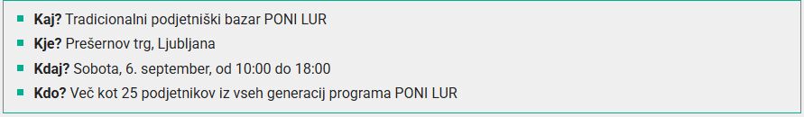 Na enem mestu se bo zbralo več kot 25 izjemnih podjetnikov iz različnih generacij programa PONI LUR (Podjetno nad izzive v Ljubljanski urbani regiji). To je edinstvena priložnost, da spoznate obraze in zgodbe za raznolikimi blagovnimi znamkami, ki so pod mentorstvom zrasle iz idej v uspešne tržne zgodbe. Na stojnicah boste našli vse od trajnostnih izdelkov in ročno izdelanega nakita do naprednih tehnoloških rešitev – vsi pa nosijo osebno zgodbo o strasti, vztrajnosti in ustvarjalnosti.