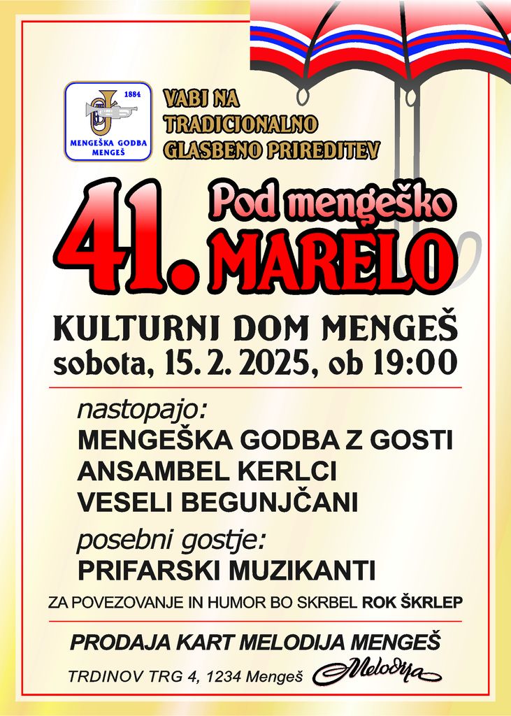 Mengeška godba vabi na tradicionalno prireditev "Pod mengeško marelo", ki bo potekala v soboto, 15. februarja 2025, ob 19.00, v Kulturnem domu Mengeš – ta bo tako ponovno zazvenel v ritmih narodnozabavne glasbe.