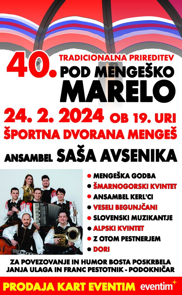Mengeška godba vabi na že jubilejno 40. tradicionalno prireditev Pod Mengeško marelo, ki bo potekala jutri, 24. februarja 2024, ob 19. uri v Športni dvorani Mengeš. Nastopili bodo izjemni domači glasbeniki: Mengeška godba, Šmarnogorski kvintet, Ansambel Kerl'ci, Veseli Begunjčani, Slovenski muzikantje, Alpski kvintet z Otom Pestnerjem in kvintet Dori.