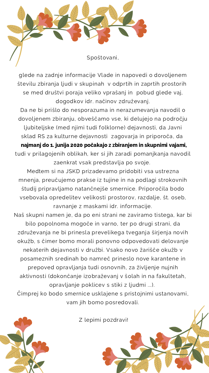 Da ne bi prišlo do nesporazuma in nerazumevanja navodil o dovoljenem zbiranju, obveščamo vse, ki delujejo na področju ljubiteljske (med njimi tudi folklorne) dejavnosti, da Javni sklad RS za kulturne dejavnosti zagovarja in priporoča, da najmanj do 1. junija 2020 počakajo z zbiranjem in skupnimi vajami, tudi v prilagojenih oblikah, ker si jih zaradi pomanjkanja navodil zaenkrat vsak predstavlja po svoje.