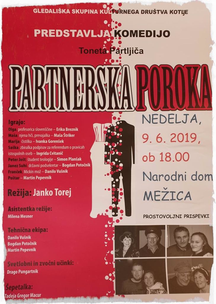V nedeljo, 9. 6. 2019, ob 18. uri vabljeni v Narodni dom Mežica na komedijo Toneta Partljiča Partnersko poroko v izvedbi gledališke skupine KD Kotlje.