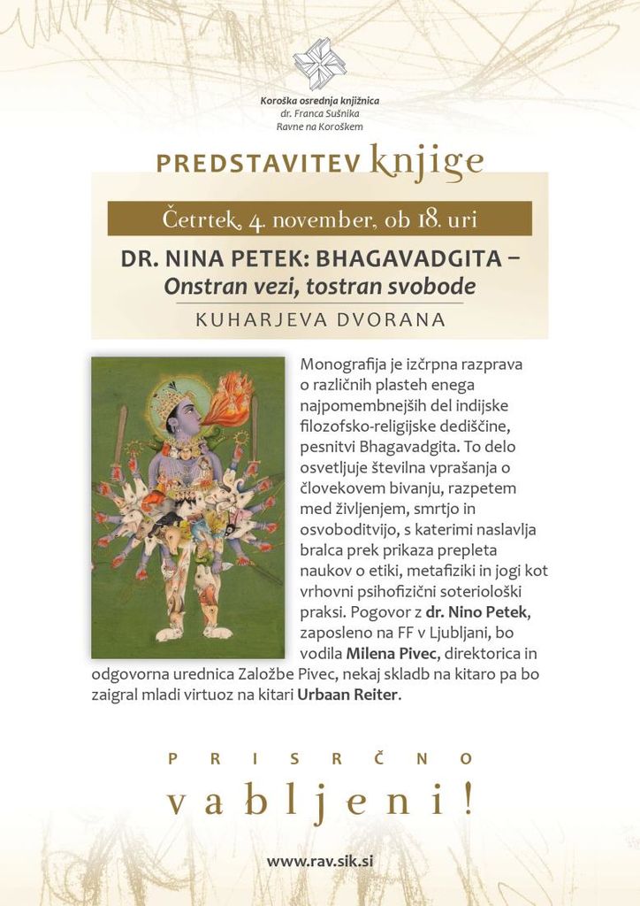 Vabljeni na predstavitev knjige Mežičanke avtorice dr. Nine Petek - Bhagavadgita z naslovom Onstran vezi, tostran svobode, ki bo v Kuharjevi dvorani Koroške osrednje knjižnice dr. Franca Sušnika Ravne na Koroškem, v četrtek, 4. novembra, ob 18.00.