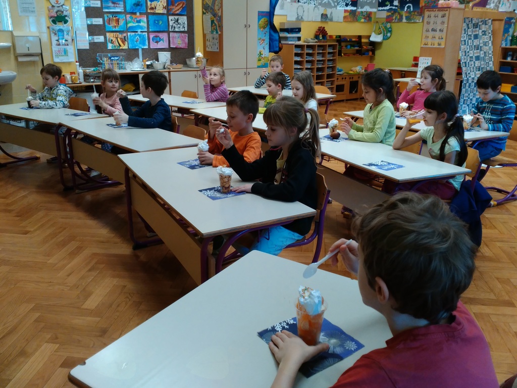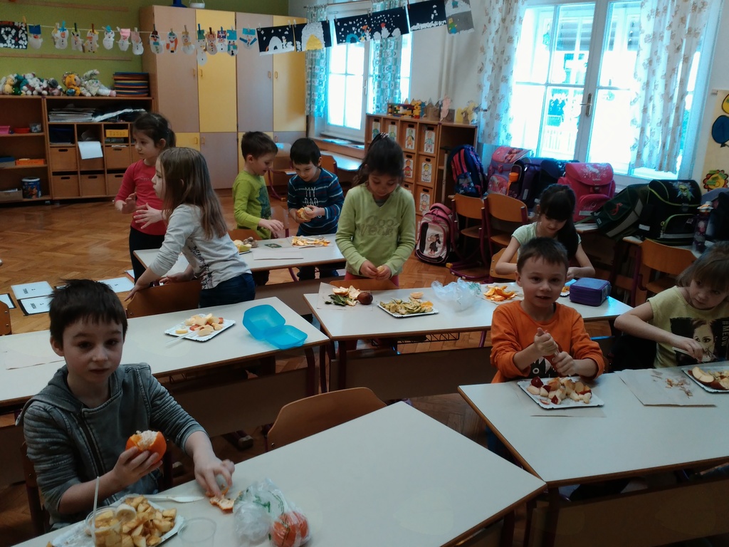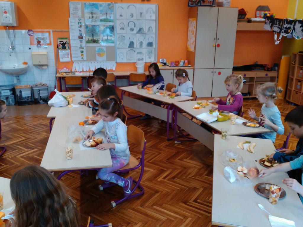Del dneva pred zimskimi počitnicami je bil namenjen dejavnosti, pri kateri so otroci uživali, hkrati pa je to tudi popotnica za zdravo življenje. Spoznavali so, kako sami poskrbijo za zdravje, kako pomembno je umivanje, kako pravilno razvrščamo odpadke, kako kulturno uživamo hrano, na kaj moramo paziti pri lupljenju in rezanju sadja, pa še marsikaj se je v pogovoru slišalo.