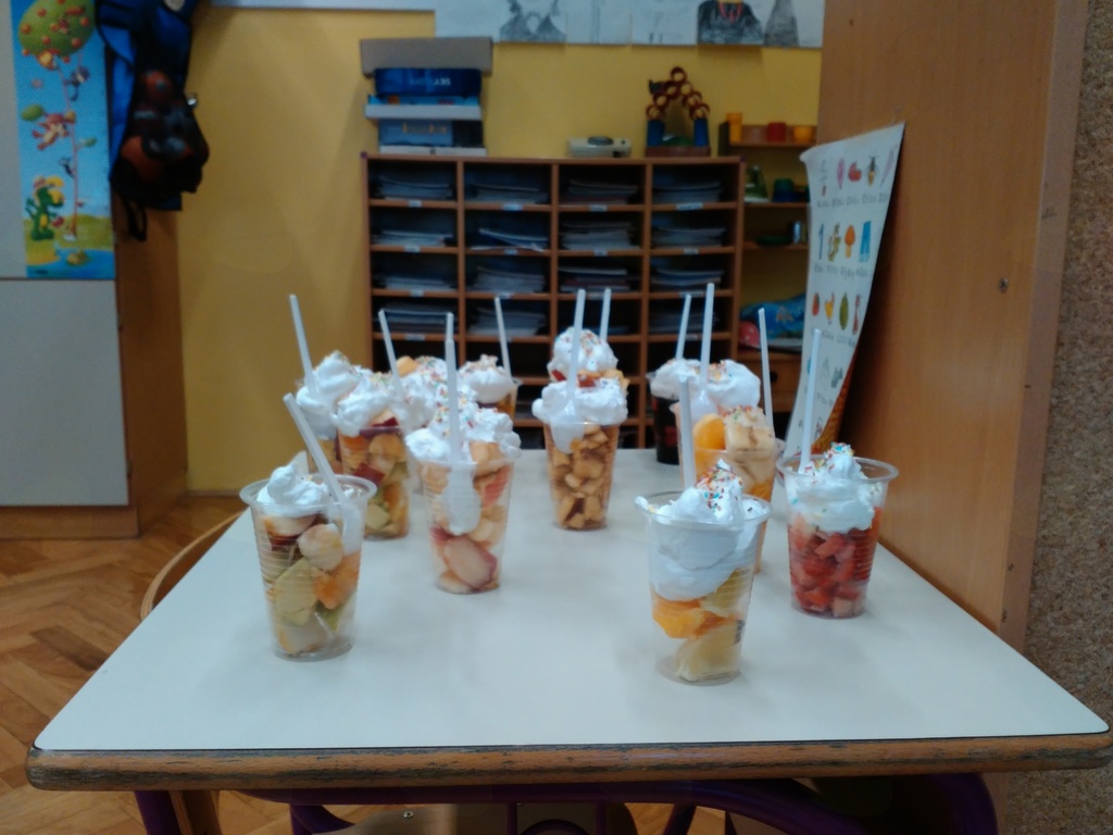 Otroci so si pripravili sadno solato. Tisti, ki so to želeli, so na vrh dodali še smetano. Bilo je razburljivo, zanimivo, lepo in okusno.