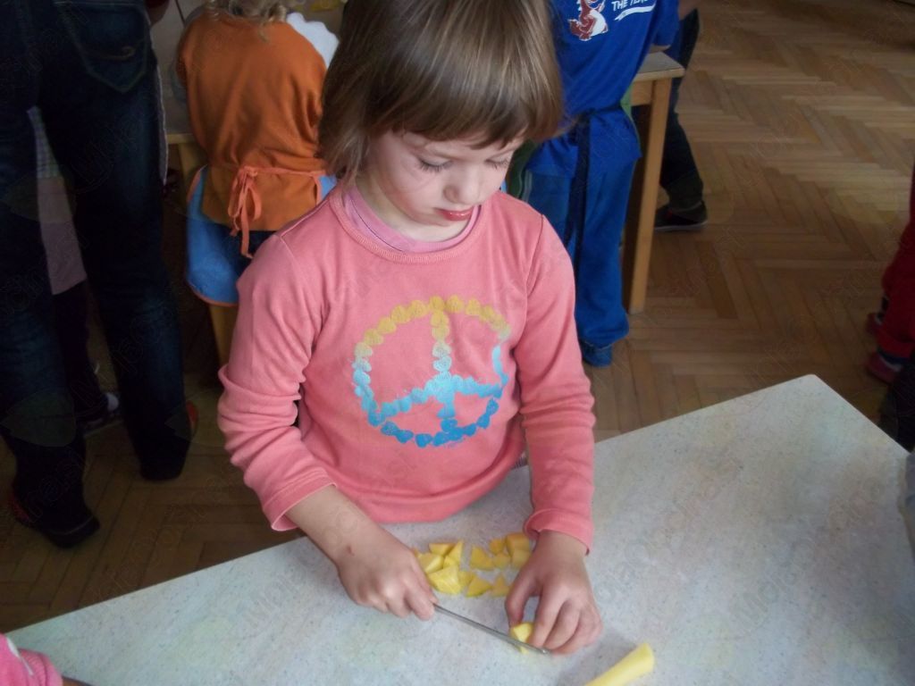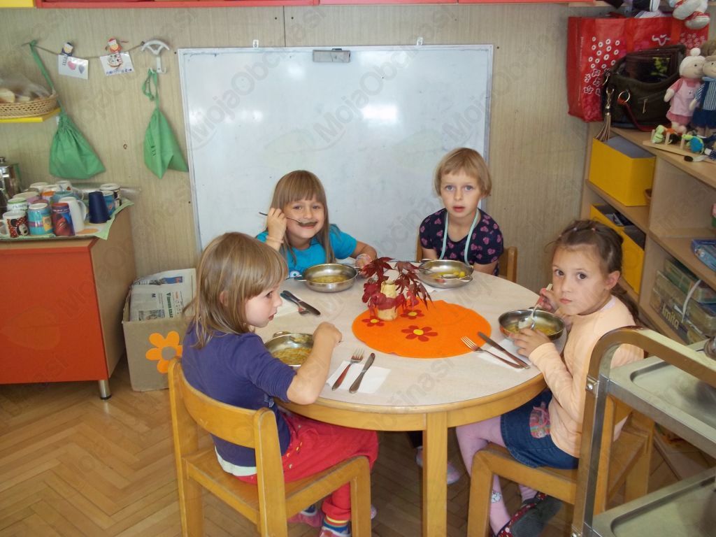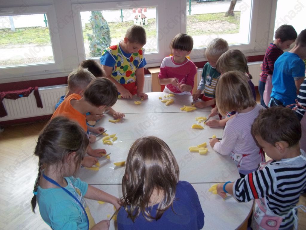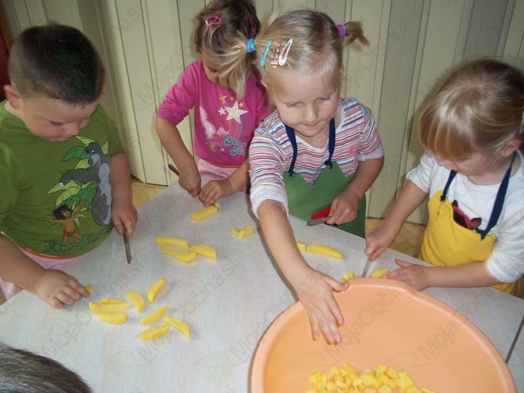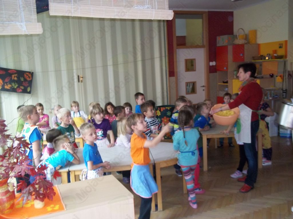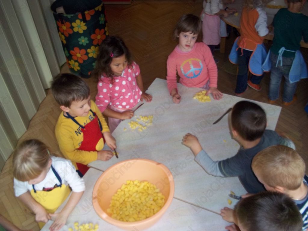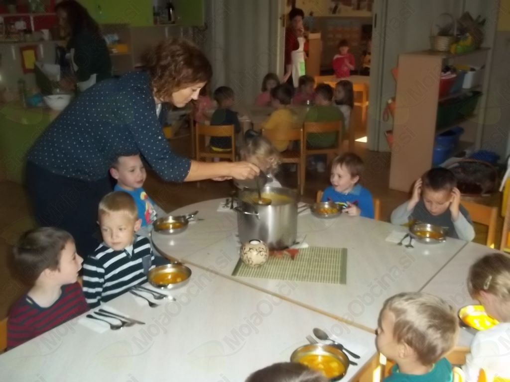 Veselo na delo! Otroci so sesekljali krompir in bučo, stresli v lonec, prilili z vodo ter dodali začimbe. Kot pravi kuharji smo tudi mi dodali nekaj posebnega – ščepec prijateljstva – in iz lonca je zabrbotalo ter zadišalo po bučni juhi prijateljstva.