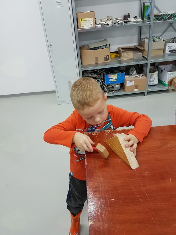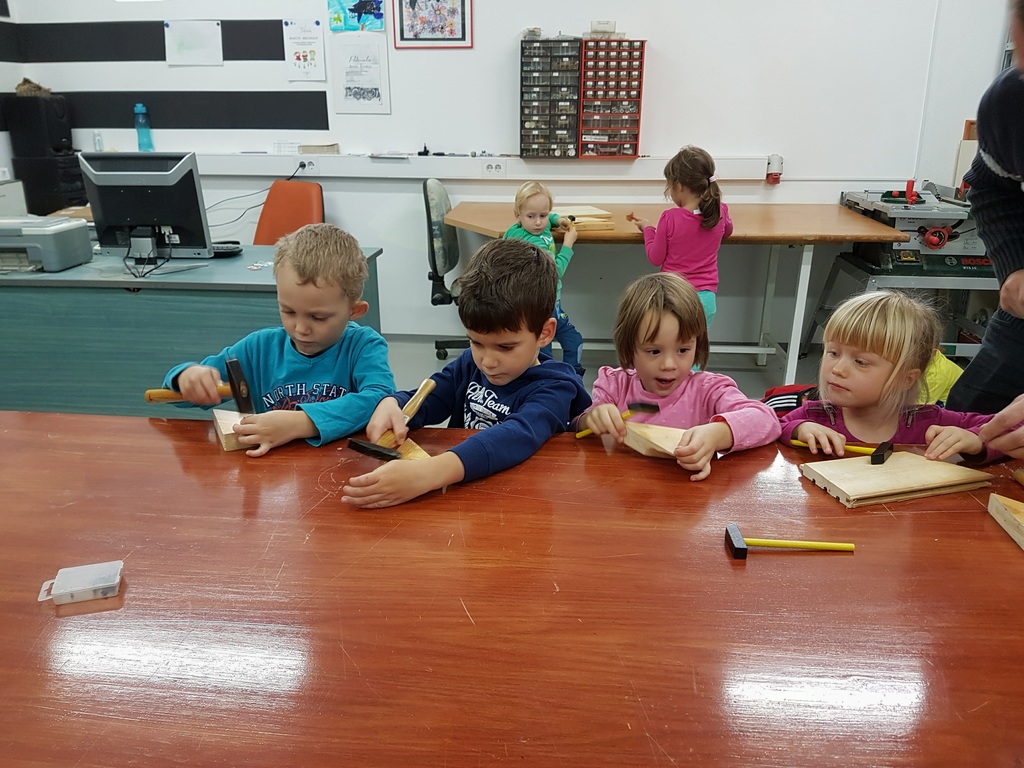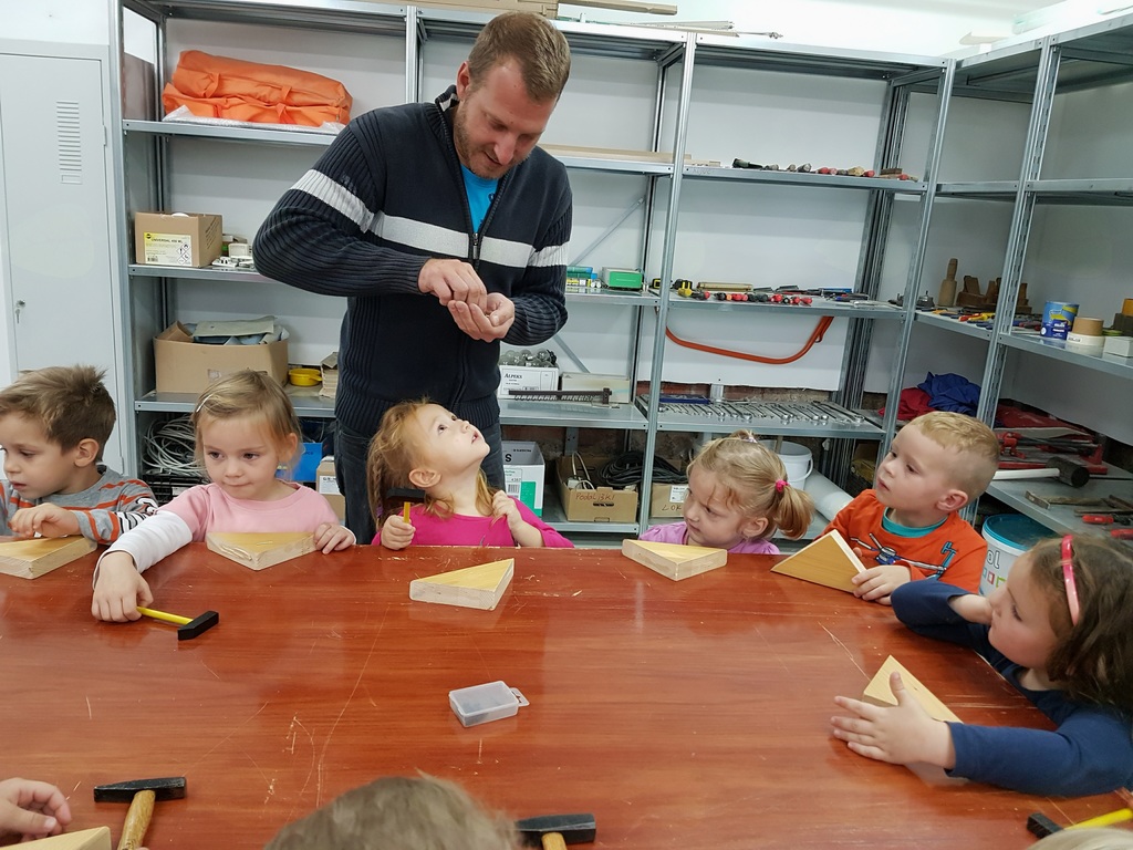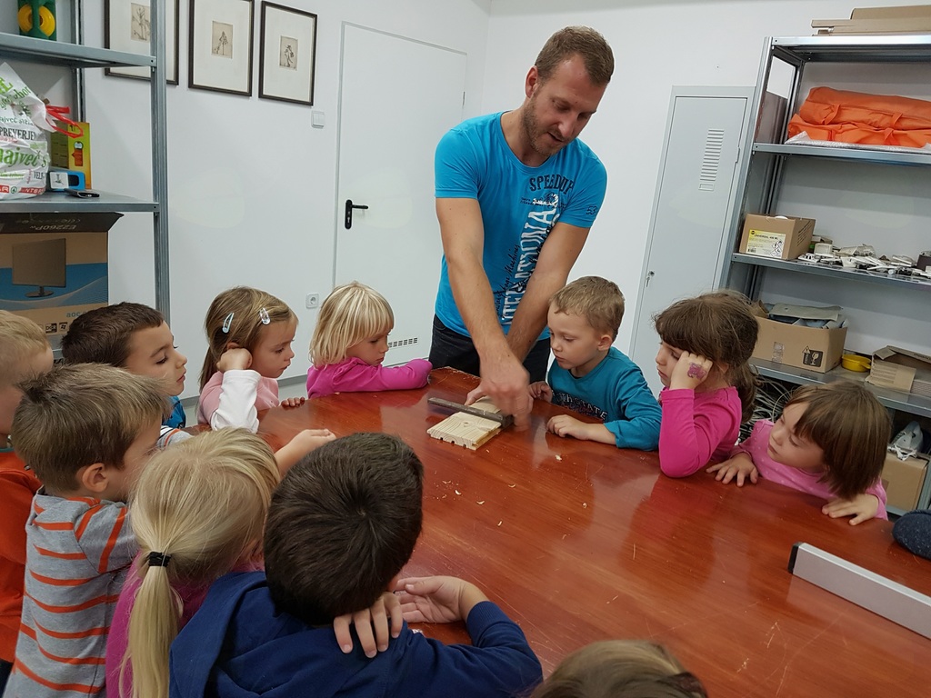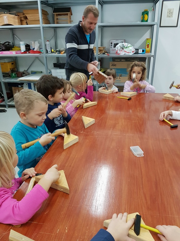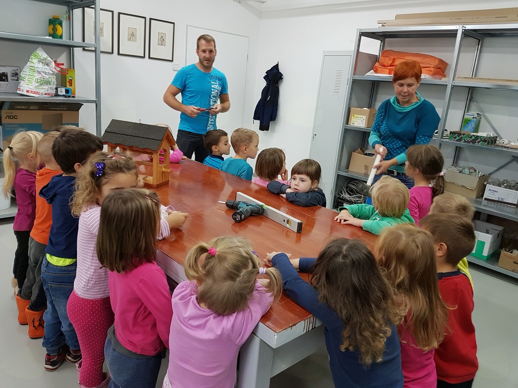 Zanimivo je bilo spoznati delo hišnika. Poleg možnosti držanja kladiva, zabijanja žebljev, smo spoznali tudi namen krožne žage, vrtalnega stroja, izvijačevc in vodne tehnice.