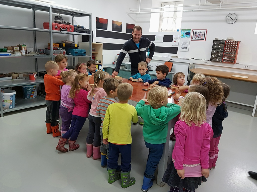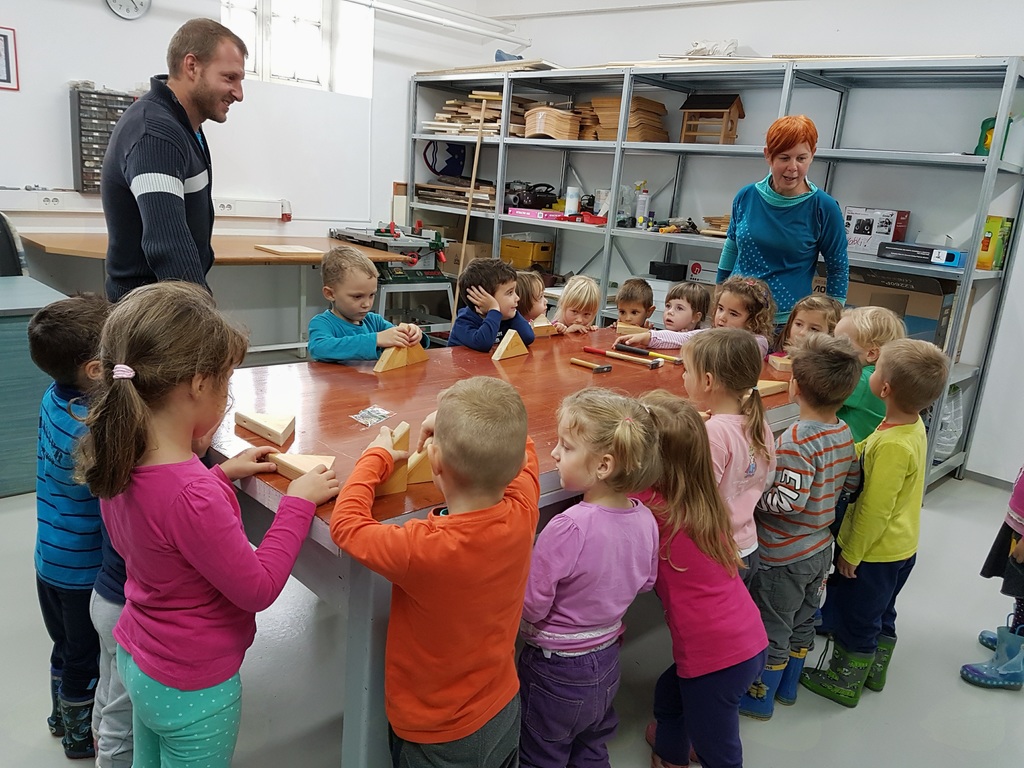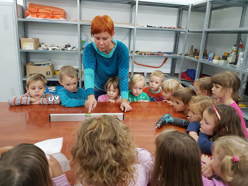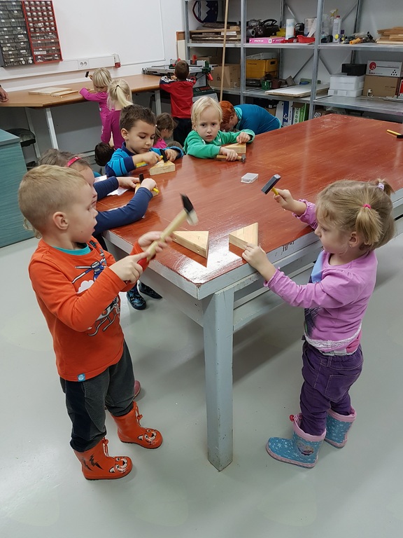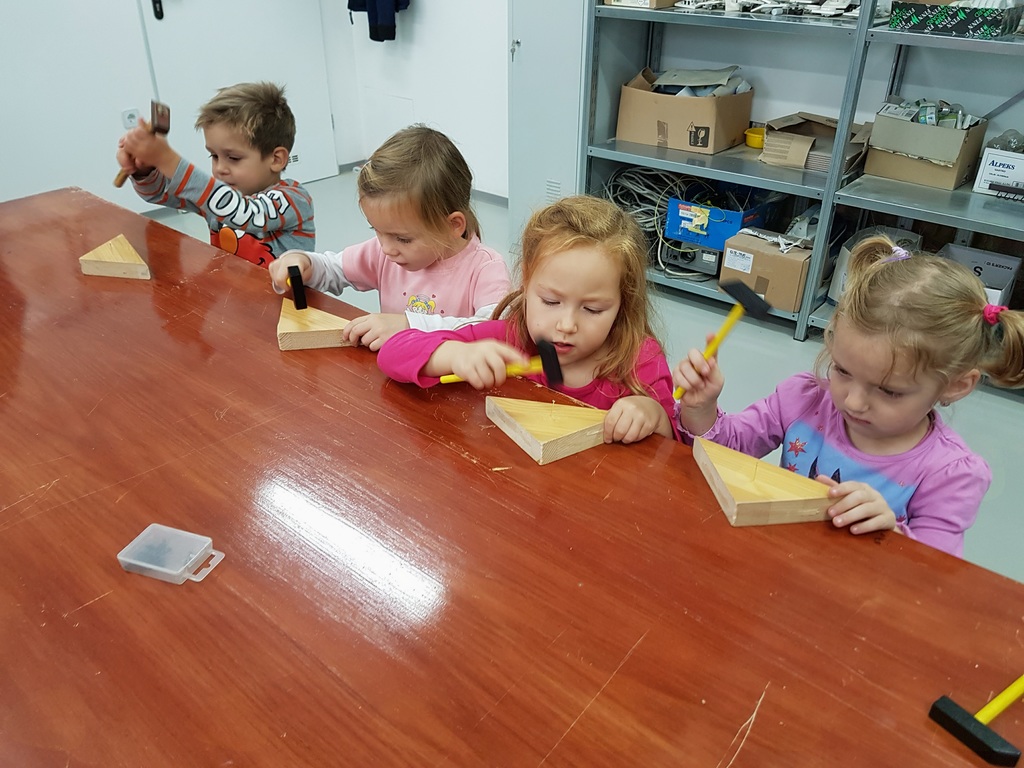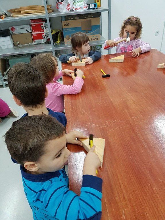 Zanimivo je bilo spoznati delo hišnika. Poleg možnosti držanja kladiva, zabijanja žebljev, smo spoznali tudi namen krožne žage, vrtalnega stroja, izvijačevc in vodne tehnice.