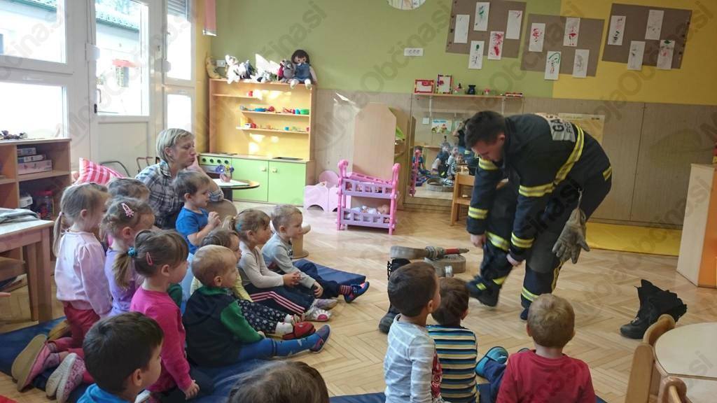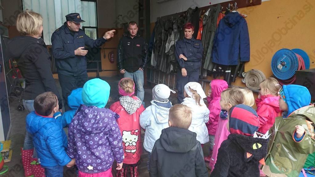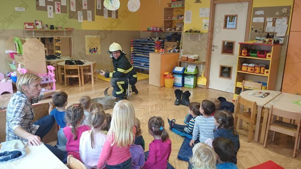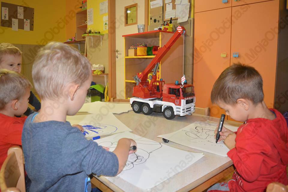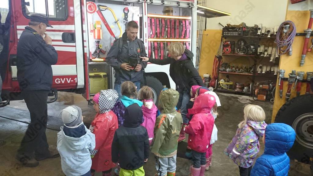 Oktober je spet tu in mi smo se že zelo veselili obiska pri naših gasilcih. Prijazno so nas povabili na kostanjev piknik, pokazali pa so nam tudi svoje gasilske tovornjake in opremo. Še posebej všeč nam je bil velik gasilski avto, v katerega smo se lahko tudi usedli in s pomočjo gasilca prižgali sirene. Polni vtisov smo v vrtcu naslikali gasilske tovornjake, ki zdaj krasijo našo igralnico. Našemu povabili se je odzval tudi gasilec Blaž, ki nam je pokazal svojo opremo in nekatere pripomočke. Demonstriral nam je »superhitrostno« oblačenje gasilcev pred odhodom na požar in nam razložil pravila primernega vedenja v primeru požara v našem vrtcu.