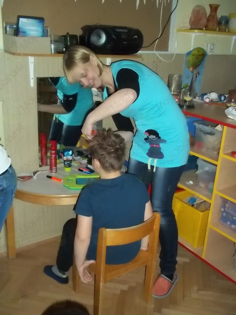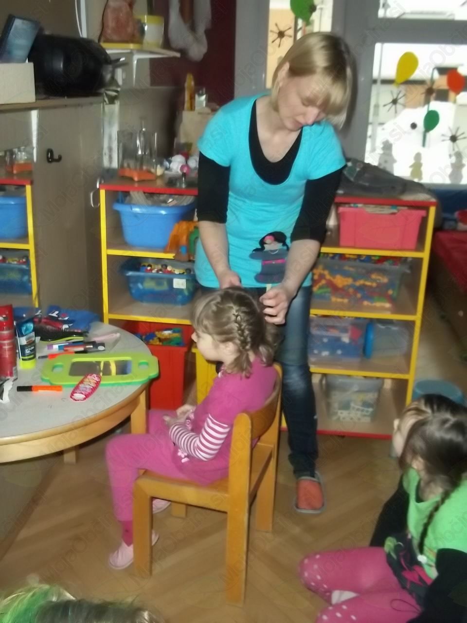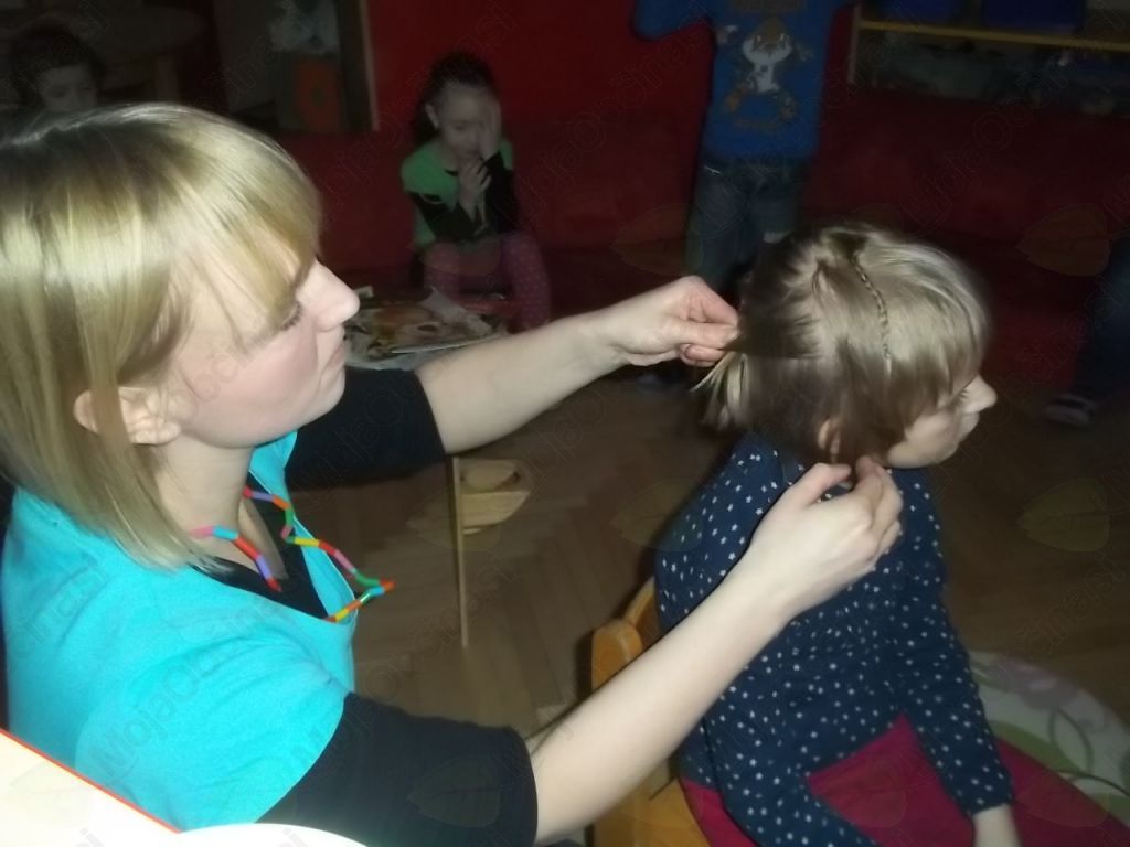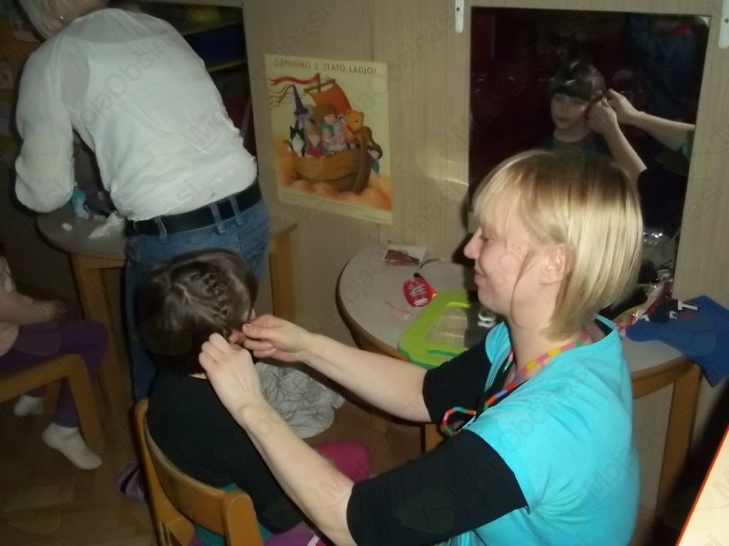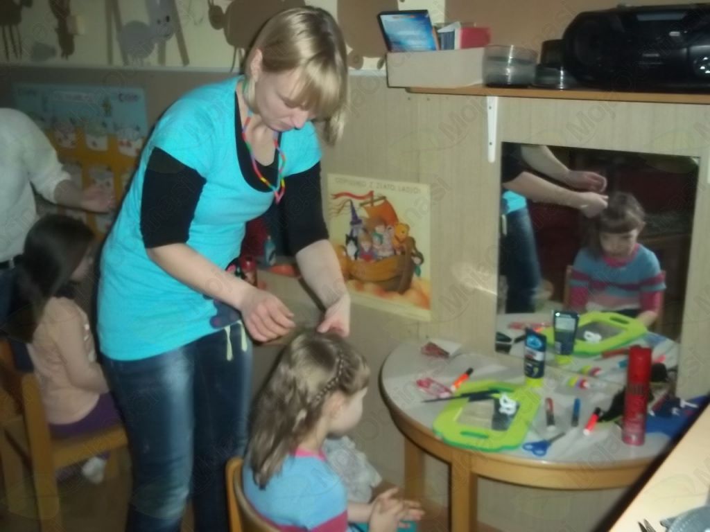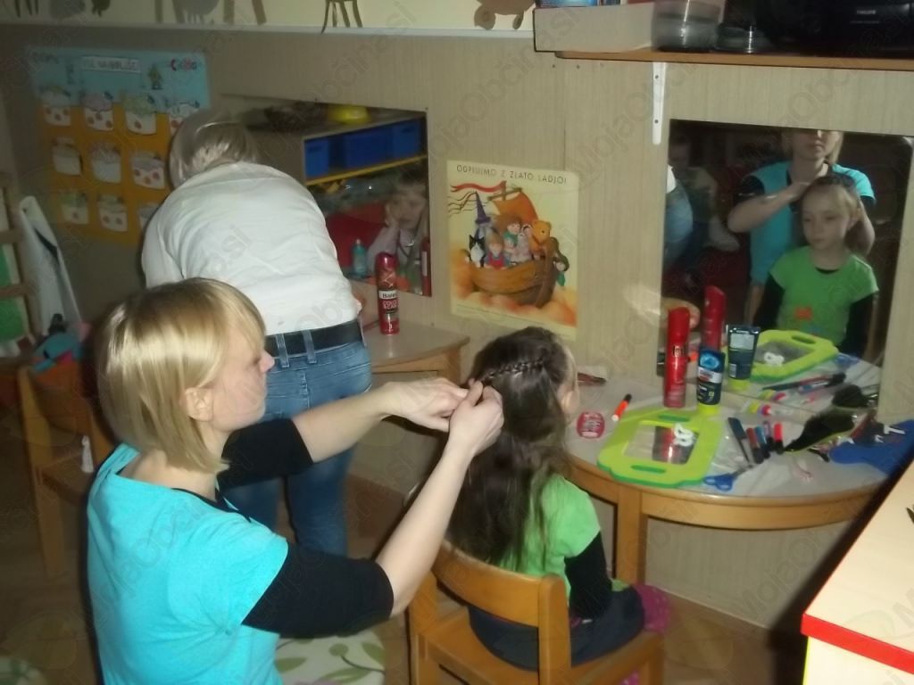 Tako smo našo igralnico spremenili v frizerski salon, kjer ni manjkala niti čakalnica, da so otroci, medtem ko so čakali na frizure, lahko prelistali kakšno revijo. Vida in Klavdija sta zavihali rokave in brž polepšali naše glave!