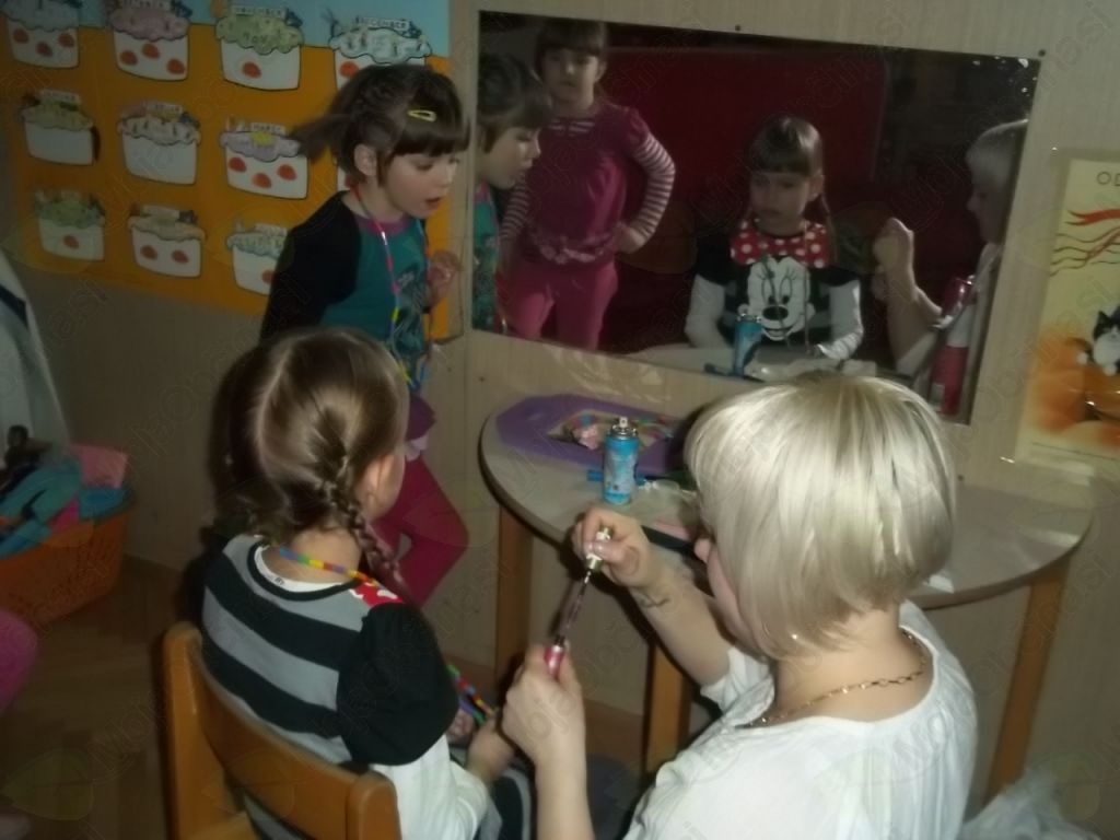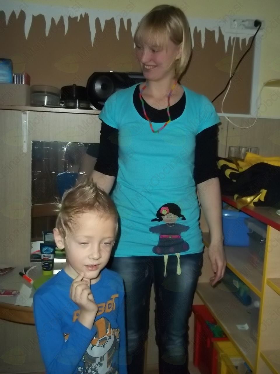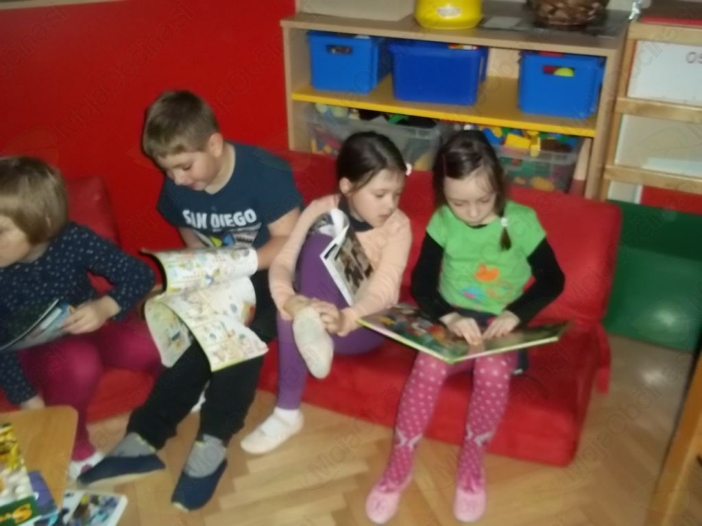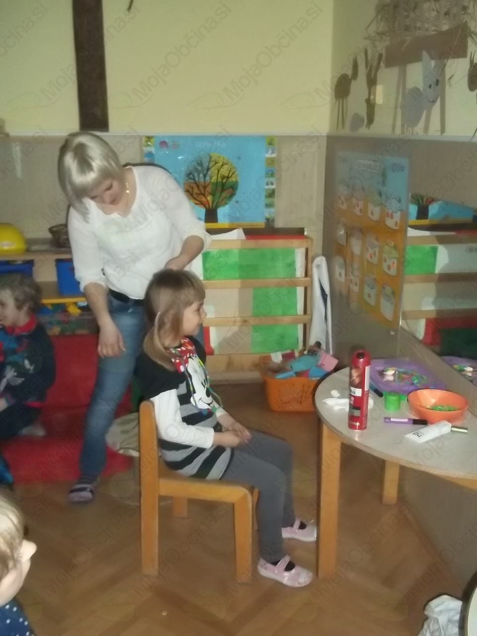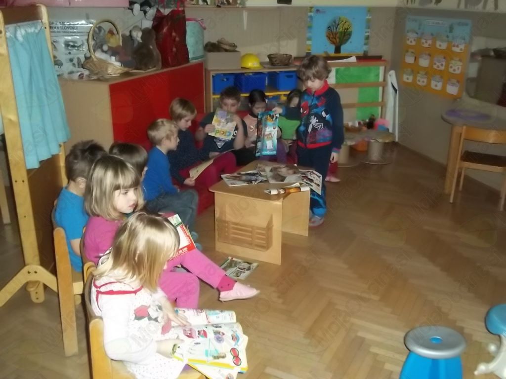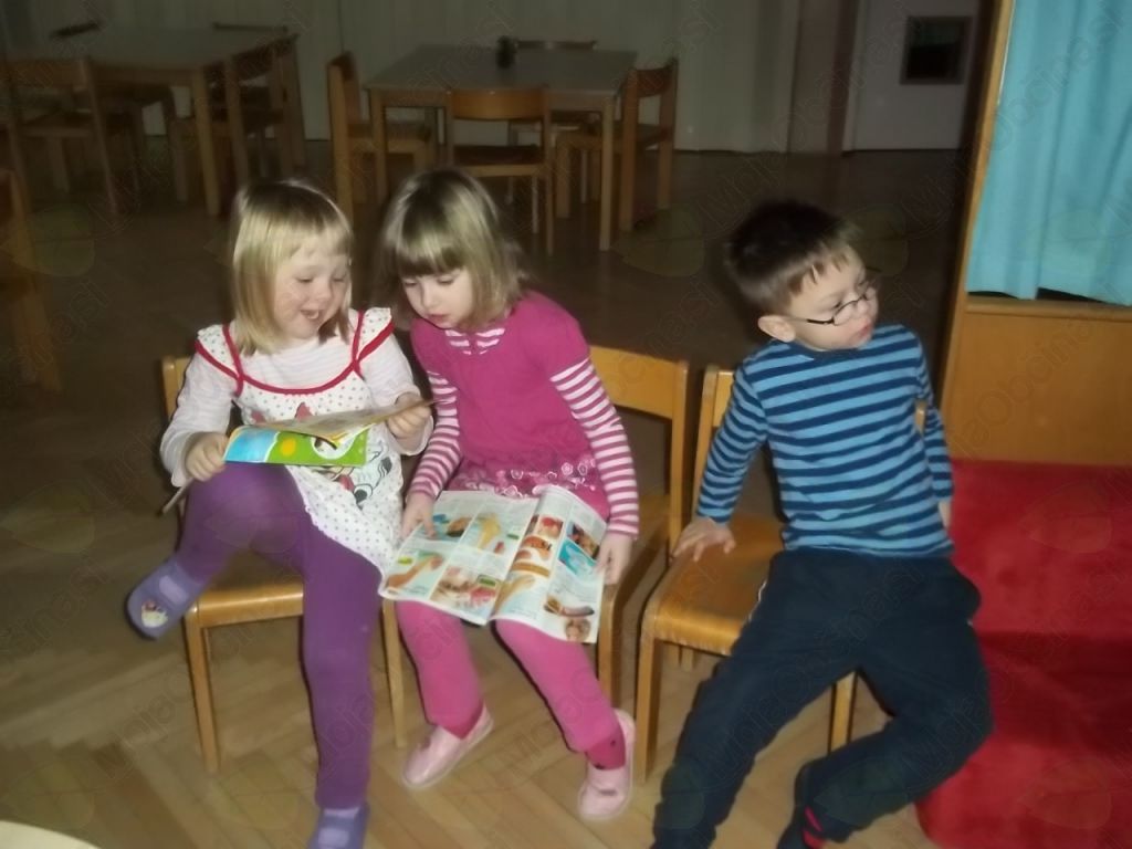 Tako smo našo igralnico spremenili v frizerski salon, kjer ni manjkala niti čakalnica, da so otroci, medtem ko so čakali na frizure, lahko prelistali kakšno revijo. Vida in Klavdija sta zavihali rokave in brž polepšali naše glave!