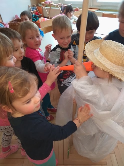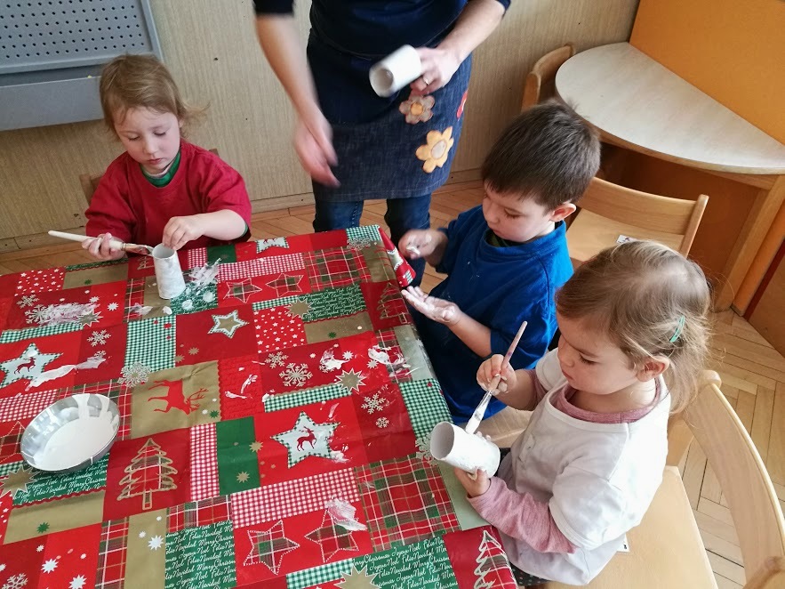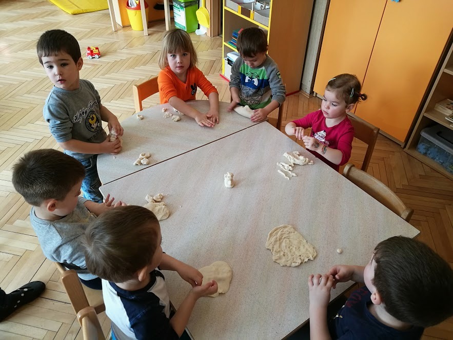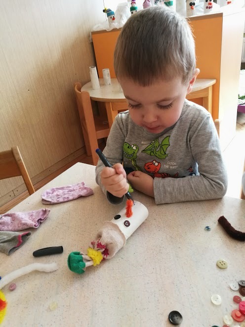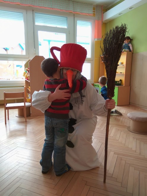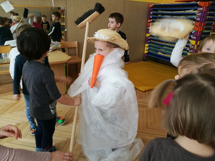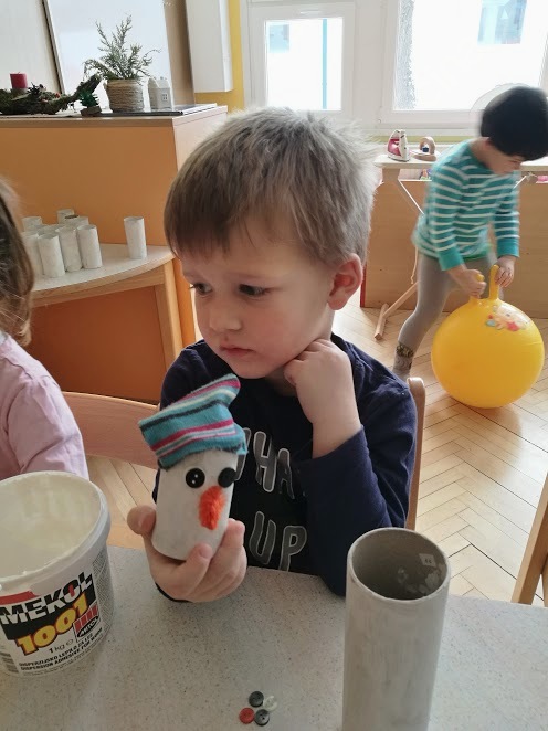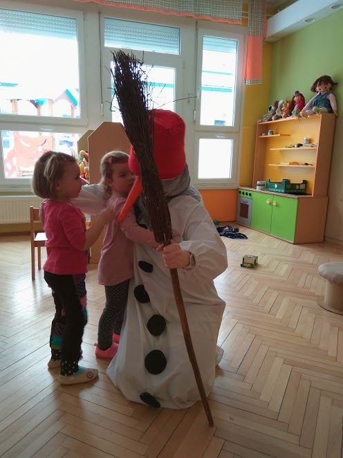 "Lej, zuna sneg gleee" je odmevalo v naši igralnici. Veselje in radost otrok sta bili nepopisni, zato smo se hitro odpravili na vrtčevsko dvorišče. Skupaj smo napravili snežaka, se sankali po našem hribu in se kepali s sneženimi kepami. V vrtcu smo iz slanega testa oblikovali snežake ter jih izdelali tudi iz odpadnih rolic. Otroci so bili nad delom navdušeni, še bolj pa jih je razveselil obisk snežaka v igralnici. Seveda so potem tudi sami oblekli njegova oblačila, se igrali, peli pesmice in plesali.