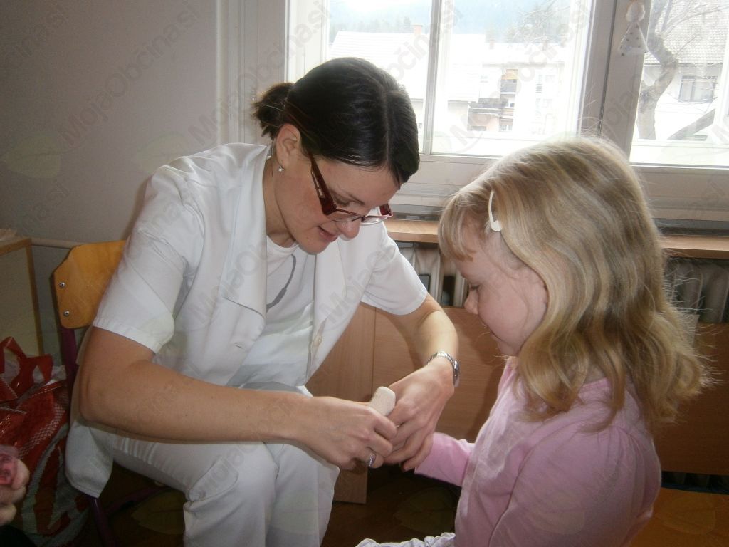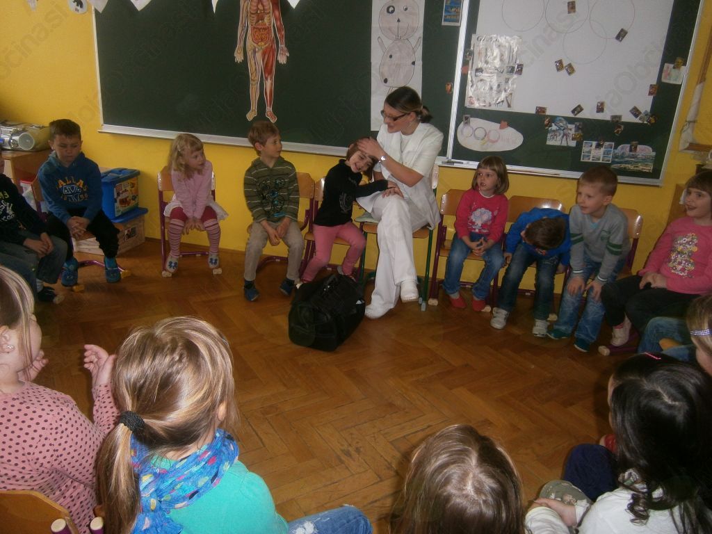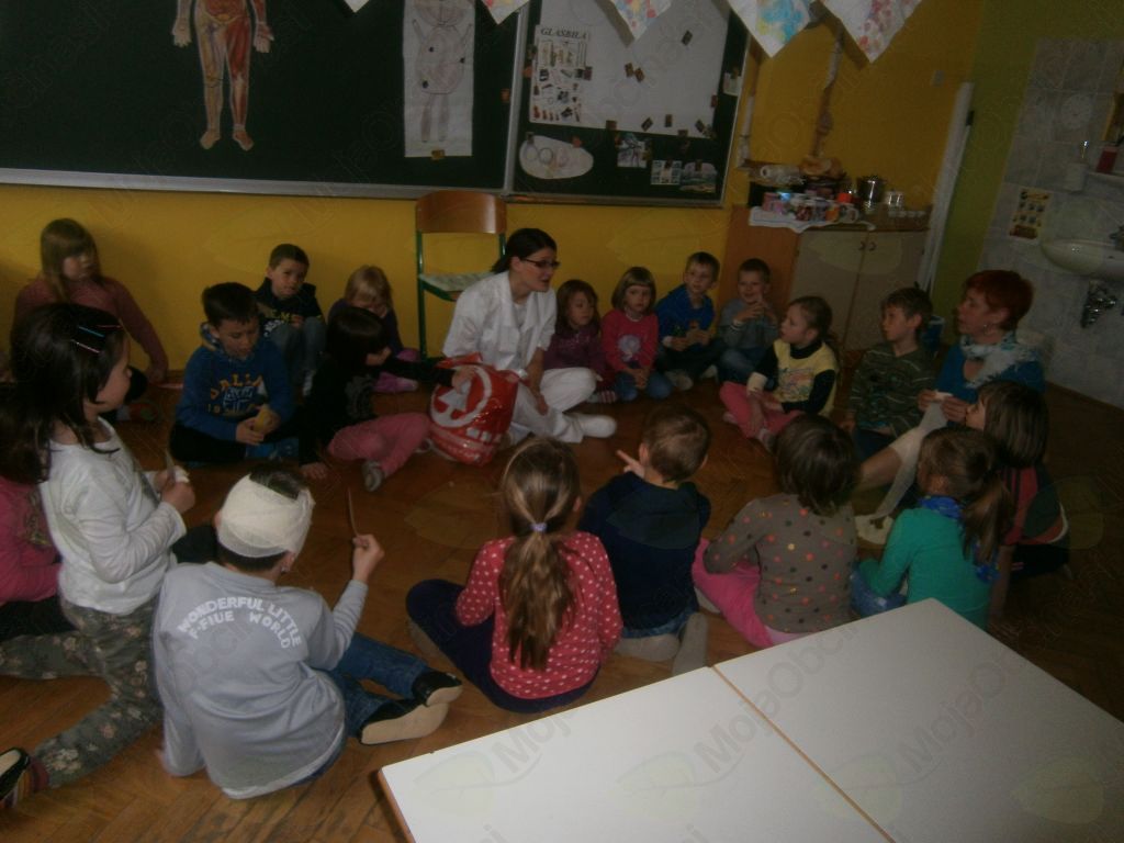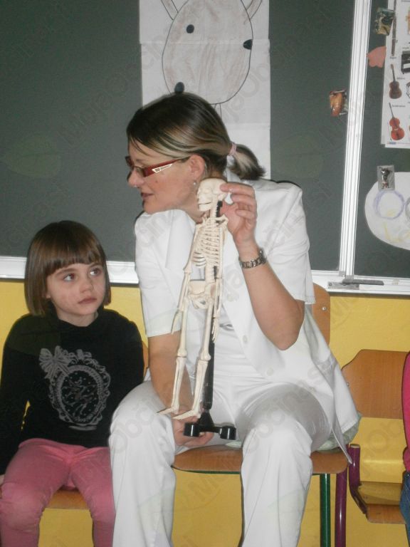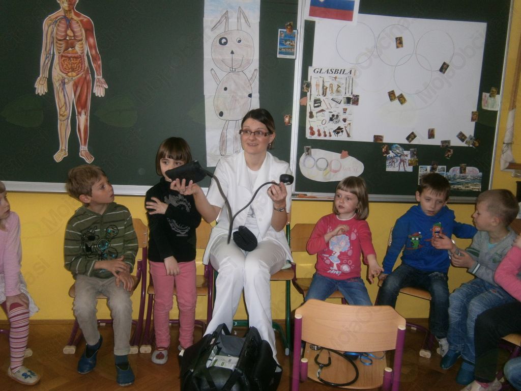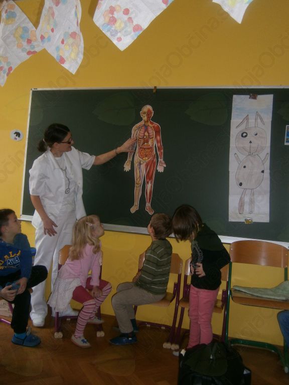 Človek je del družbenega okolja, v katerem raste, živi, deluje. Da lahko otroci sodelujejo z okoljem in vplivajo nanj, morajo najprej spoznati bližnje družbeno okolje; vsakdanje življenje ljudi, družinsko življenje, delovna okolja in poklice,… (povzeto po kurikulu). V starosti petih, šestih let se je enostavno spremeniti v zdravnico/ka. Svoje telo in funkcijo okončin že dobro poznamo, a pokukati med notranje organe, odkriti hrbtenico, medenico, žile, mišice, šteti kosti na modelu okostnjaka, ga pravilno sestaviti pa ni kar tako. Po strpnem čakanju v čakalnici, smo imeli možnost obiskati zdravnico, ji zaupati svoje težave, se odpraviti v lekarno po zdravila in vse to kar v igralnici.