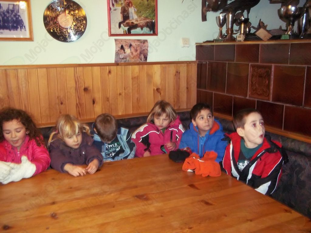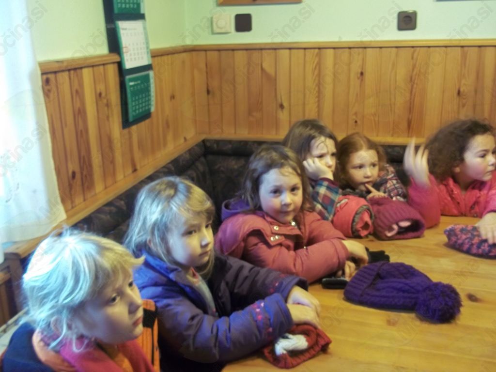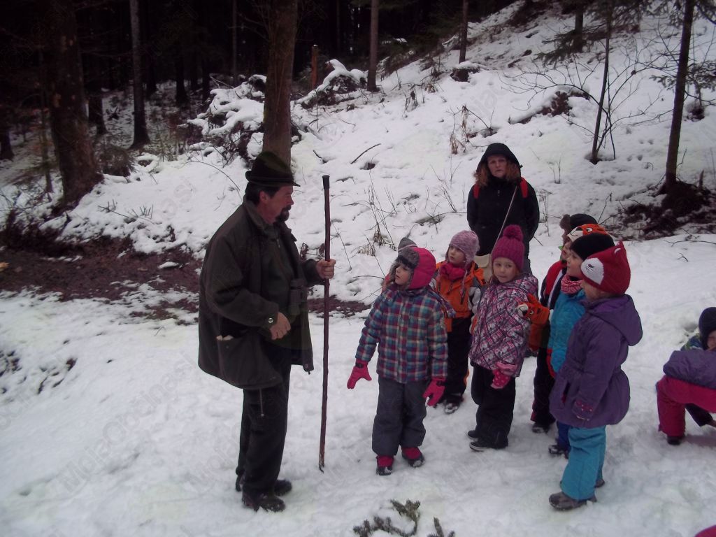 V petkovem sončnem dopoldnevu se je nas štiriindvajset nadebudnežev in radovednežev skupaj z vzgojiteljicama podalo proti kmetiji Kajžar. Na razpotju nas je čakal lovec, gospod Gusti, ki nas je prijazno pozdravil in povabil na ogled bližnjega krmišča. Podali smo se skozi obrobje gozda proti krmišču, kjer smo zagledali čudovito majhno jaso. Na krmilnico smo odložili hrano za živali in se nato razgledali naokoli. Zasledili smo sledi živali v snegu, ponekod celo njihove iztrebke ter majhno ležišče pod smreko, ki ga je po vsej verjetnosti uporabljala srna. Nad odkritji smo bili zelo navdušeni.