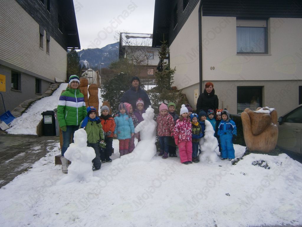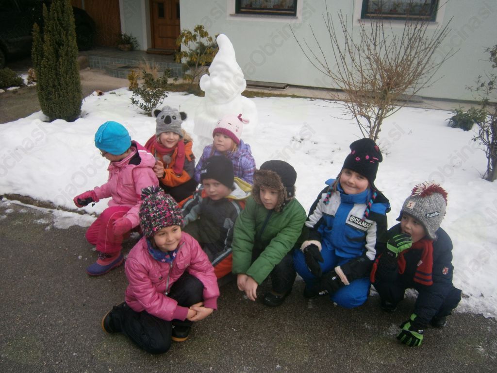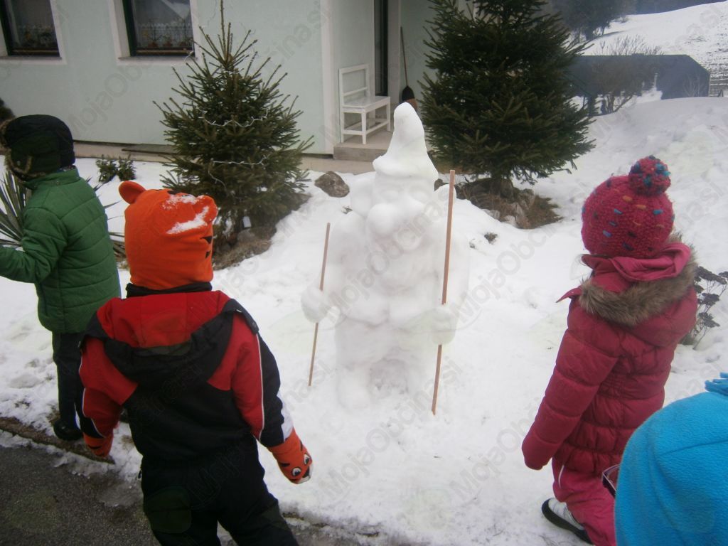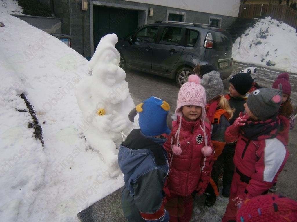 Pa smo šli. Hodili smo po tako želenem snegu in iskali Deželo Sneguljčice ter med potjo prisluhnili tudi ptičkom. Navdušenje ob pogledu na sneženo Sneguljčico, na sedem različnih palčkov, vsakega s svojo zgodbo, je bilo nepopisno. Ogledovali smo si ledene skulpture in zelo uživali. Naš prijatelj pa je zaključil: »Saj to je pa Ledena dežela Sneguljčice in sedmih palčkov!« V deželo smo povabili tudi prijatelje vzgojiteljic: Štefke, Mateje, Marjetke in Eve in imeli posebno čast, da smo lahko pozdravili umetnika Janeza Graufa, ki je deželo ustvaril. Izpod njegovih spretnih prstov je v nekaj minutah nastal pravi mali škratek. Navdušil nas je nad kiparjenjem s snegom in vsi zelo močno upamo, da nas bo narava obdarila s snegom, da bomo z ustvarjanjem nadaljevali tudi na vrtčevskem dvorišču.