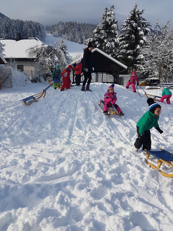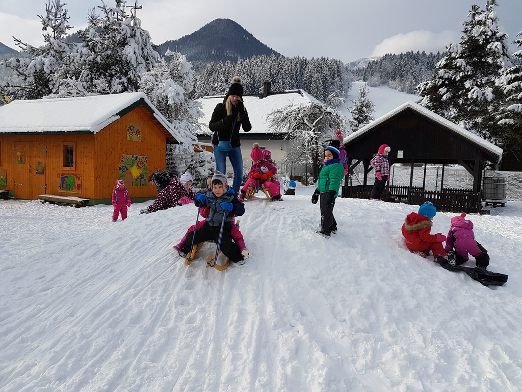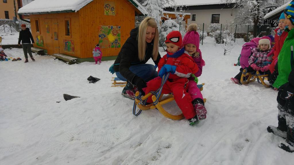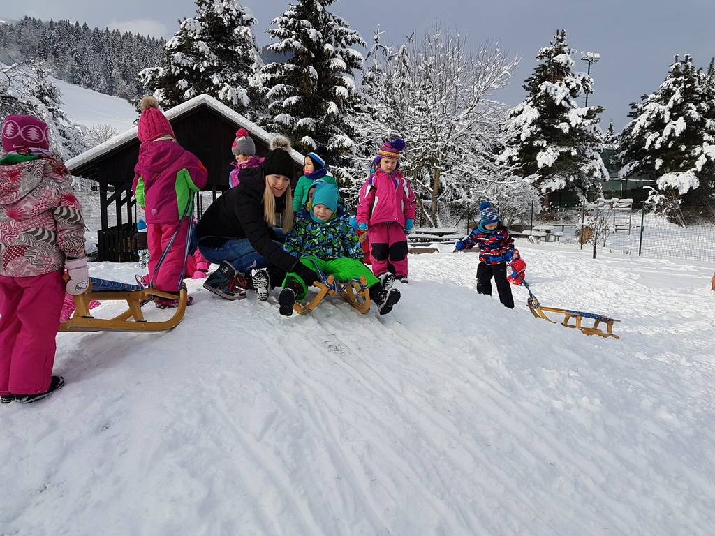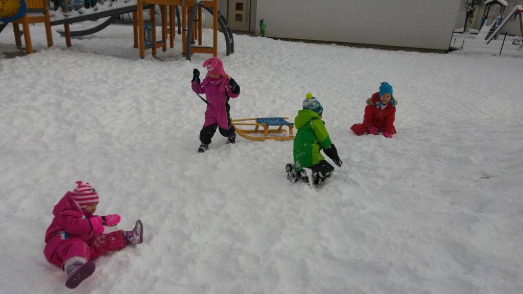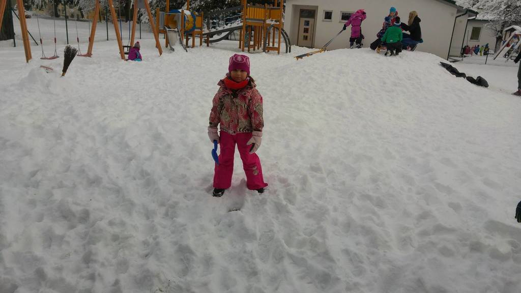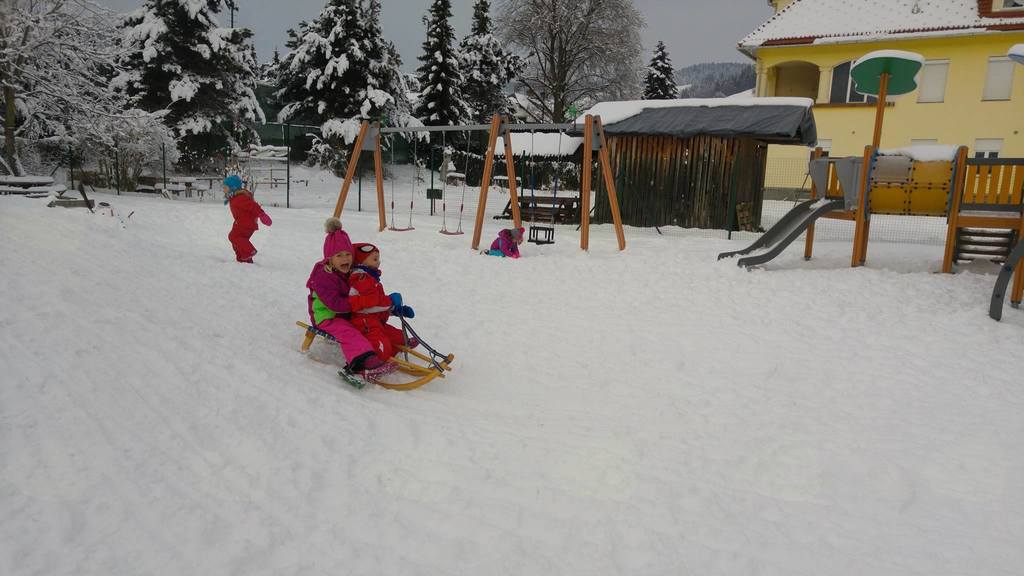 Na našem igrišču je pravo zimsko vzdušje. Po hribčku drvimo s sanmi, delamo snežake, se valjamo po snegu in tudi kepamo. Skratka uživamo!!!