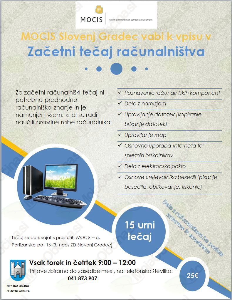 Tečaj se bo izvajal v prostorih MOCIS - a (Partizanska pot 16 - 3.nads. ZD Slovenj Gradec), vsak torek in četrtek 9:00 - 12:00.