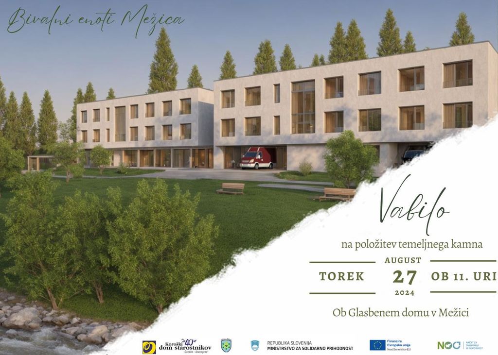 Vabimo vas na slovesnost ob položitvi temeljnega kamna za izgradnjo bivalnih enot Mežica, ki bo v torek, 27. 8. 2024 ob 11.00 ob Glasbenem domu Mežica