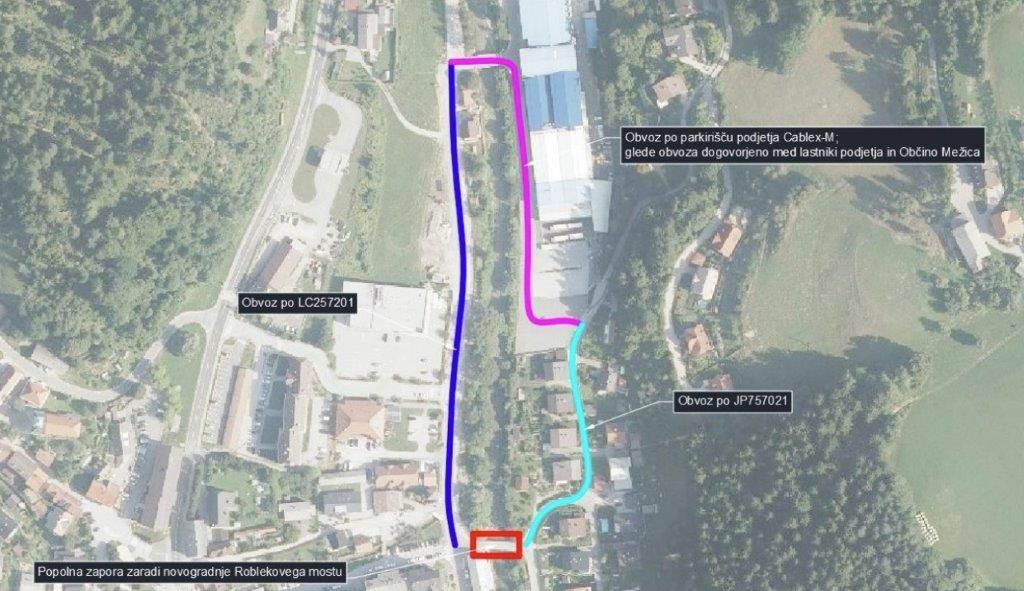 Obvestilo stanovalcem območja o pričetku del ter o popolni zapori dela Javne poti JP 7570781 »proti Jakopiču« ter popolni zapori »Roblekovega mostu« v okviru investicije »Ureditev porečja reke Meže«