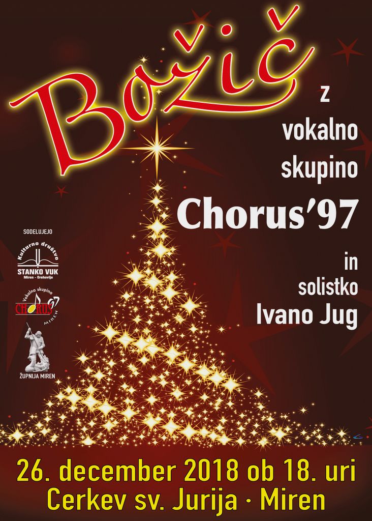 Vokalna skupina Chorus '97 in KD Stanko Vuk Miren - Orehovlje, 26. decembra 2018 ob 18.00 uri, vabita v župnijsko cerkev sv. Jurija v Mirnu na