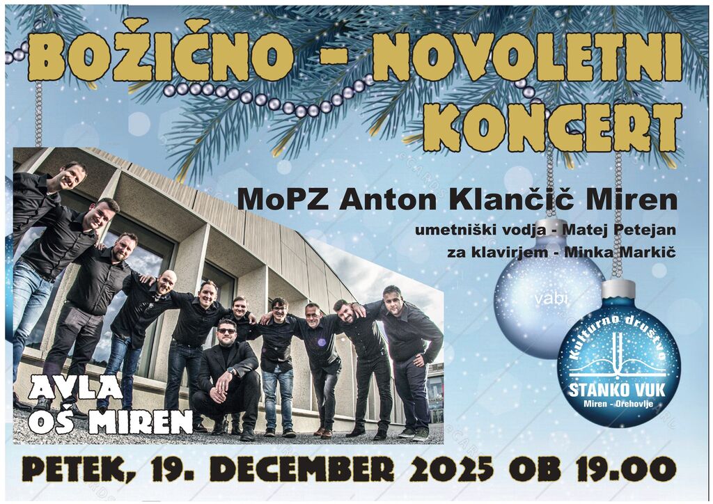 BOŽIČNO - NOVOLETNI KONCERT, ki bo v petek, 19. decembra 2025, ob 19.00 uri v avli OŠ Miren.