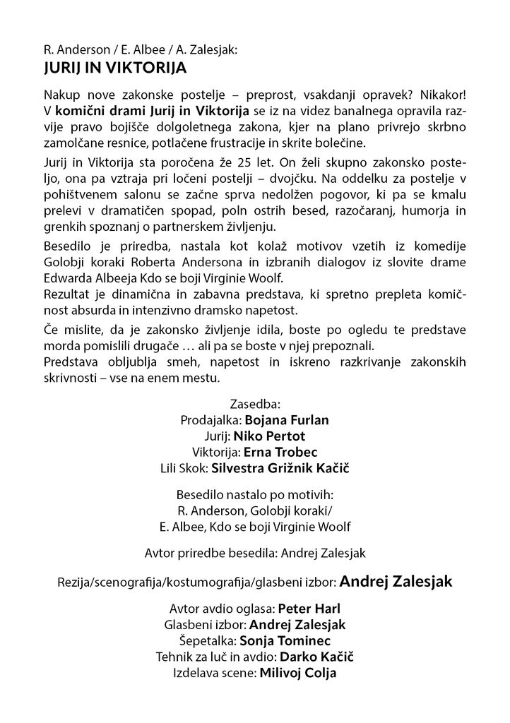 Nakup nove zakonske postelje – preprost, vsakdanji opravek? Nikakor! V komični drami Jurij in Viktorija se iz na videz banalnega opravila razvije pravo bojišče dolgoletnega zakona, kjer na plano privrejo skrbno zamolčane resnice, potlačene frustracije in skrite bolečine.