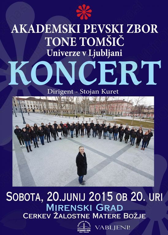KD Stanko Vuk Miren - Orehovlje vabi na koncert: AKADEMSKI PEVSKI ZBOR TONE TOMŠIČ dirigent: Stojan Kuret sobota, 20. junij 2015 ob 20.uri MIRENSKI GRAD Cerkev Žalostne Matere Božje Lepo vabljeni!