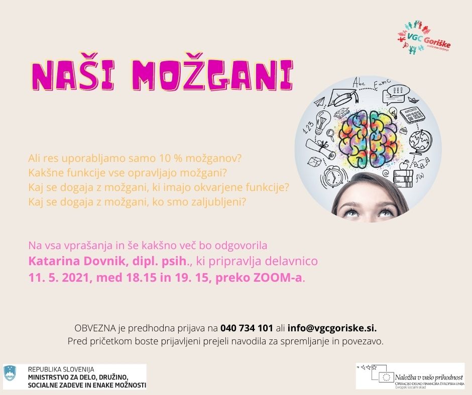 Vabljeni na delavnico NAŠI MOŽGANI, ki bo v torek, 11. 5. 2021 med 18.15 in 19.15 potekala preko ZOOM-a.