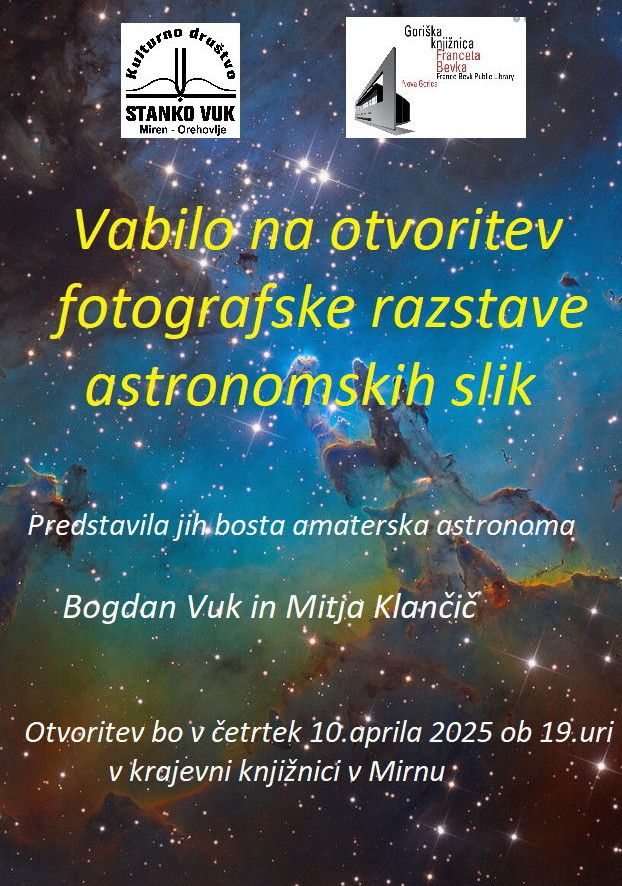 Odprtje s kratkim kulturnim programom bo v četrtek, 10. aprila 2025, ob 19.00 uri v Krajevni knjižnici Miren. Predstavila se nam bosta amaterska astronoma Bogdan Vuk in Mitja Klančič.