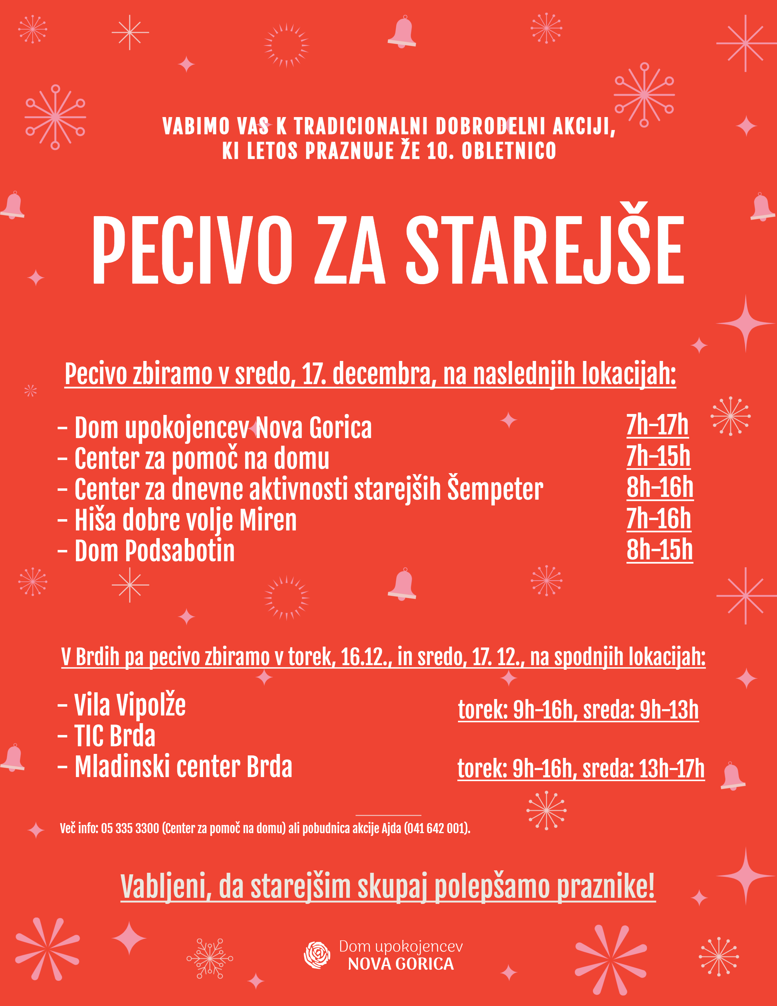 ***Priporočila: pecivo bo razdeljeno med uporabnike storitev Centra za pomoč na domu v petek, 19. 12. 2025, zato priporočamo, da prinašate suho in trajno pecivo, brez pokvarljivih nadevov.