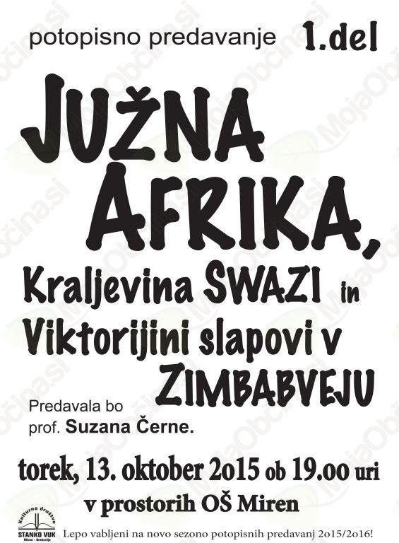 KD Stanko Vuk vabi na potopisno predavanje JUŽNA AFRIKA , KRALJEVINA SWAZI IN VIKTORIJINI SLAPOVI V ZIMBABVEJU - 1.del v torek, 13. oktobra 2015 ob 19.00 uri v OŠ Miren. Z nami bo prof. Suzana Černe. Lepo vabljeni!