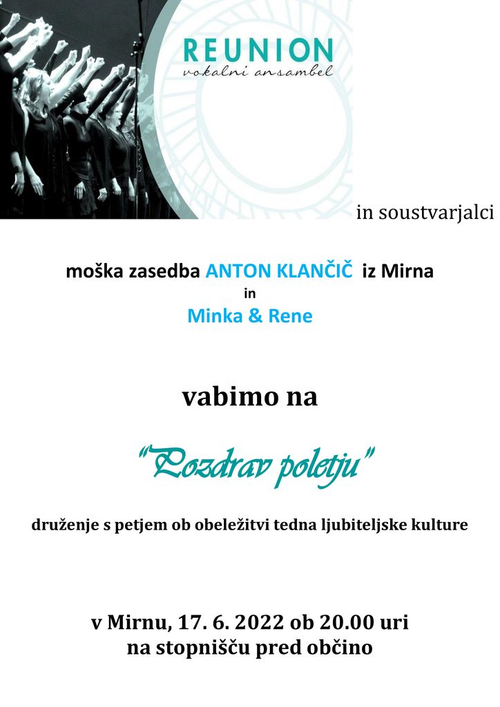 Vokalni ansambel Reunion iz Solkana bo skupaj z zasedbo Anton Klančič iz Mirna ter duetom Minka & Rene dne 17.6. ob 20. uri na stopnišču pred občino Miren-Kostanjevica obeležil Teden ljubiteljske kulture 2022.