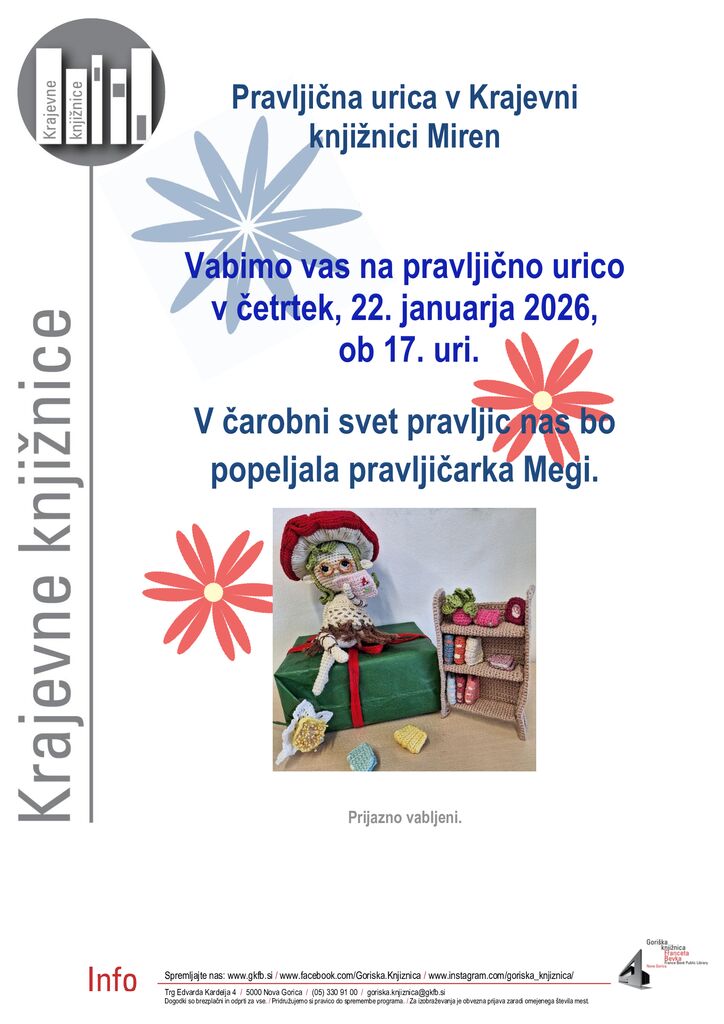 Krajevna knjižnica Miren vabi na Pravljično urico, ki bo v četrtek, 22. januarja 2026, ob 17.00 uri v Krajevni knjižnici Miren.