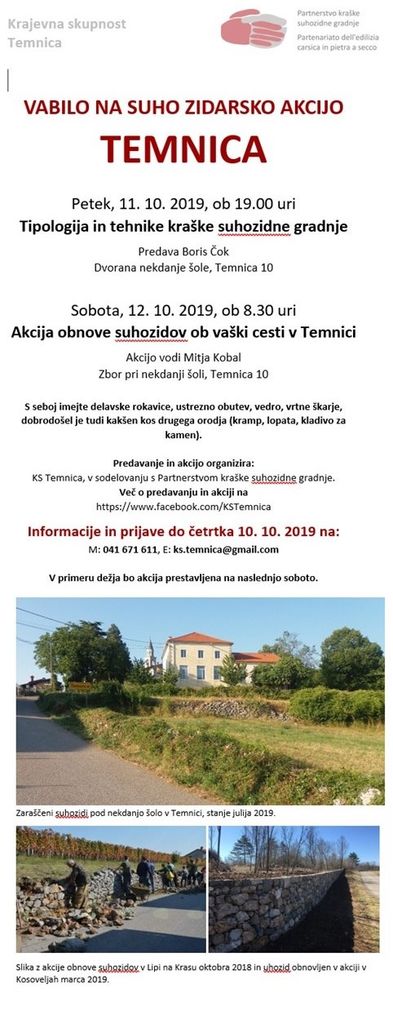 Temnica na Krasu je v letu 2019 dobila priložnost za izvedbo delavnice obnove kraških suhozidov, ki jih zadnja leta vodi Partnerstvo za kraško suho zidno gradnjo.
