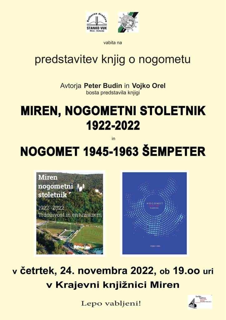 KD Stanko Vuk Miren - Orehovlje in ND adria vabita na predstavitvi knjig o nogometu, ki bo v četrtek, 24. novembra 2022, ob 19.00 uri v Krajevni knjižnici Miren.