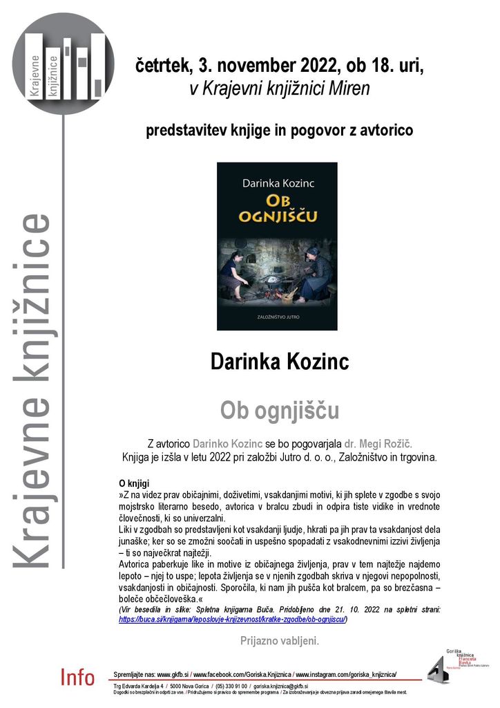 Vabljeni na predstavitev knjige Ob ognjišču in pogovor z avtorico Darinko Kozinc.