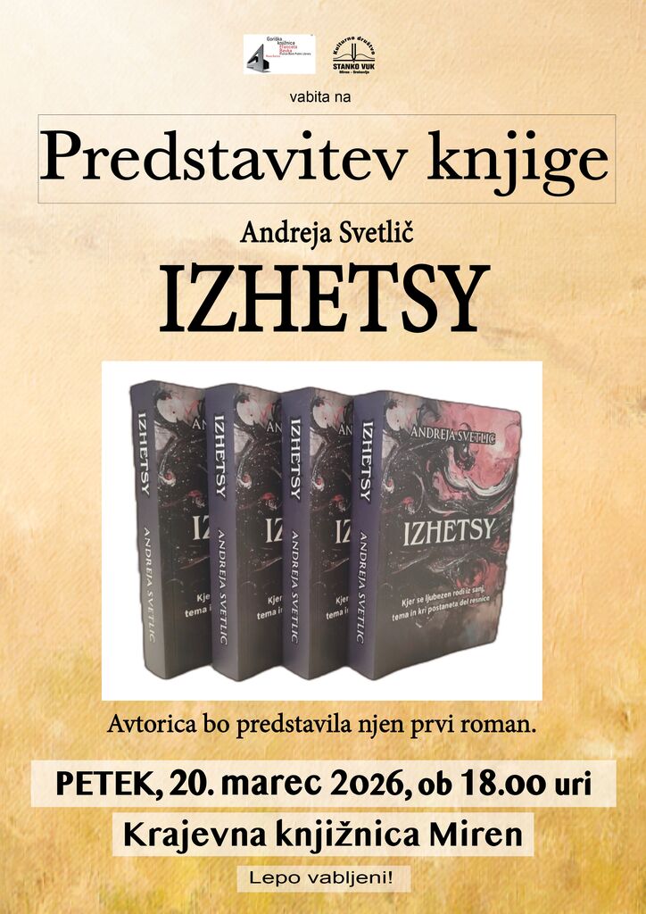KD Stanko Vuk Miren - Orehovlje vabi na predstavitev knjige z naslovom Izhetsy, ki bo v petek, 20. marca 2026 ob 18.00 uri v Krajevni knjižnici Miren.