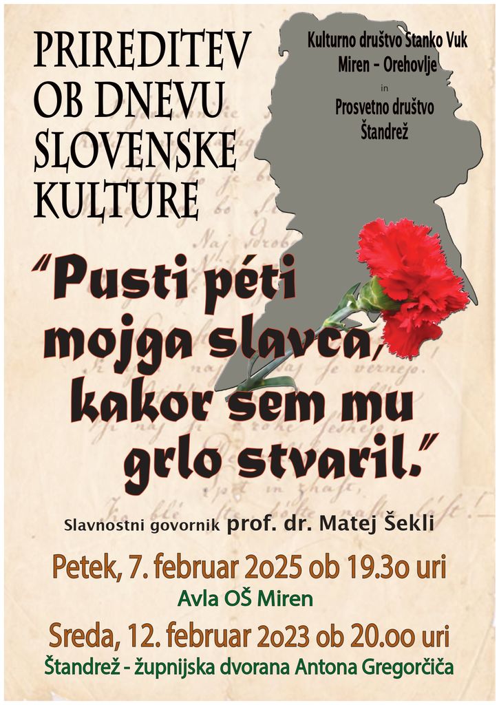 KD Stanko Vuk Miren - Orehovlje vabi na prireditev ob slovenskem kulturnem prazniku z naslovom: