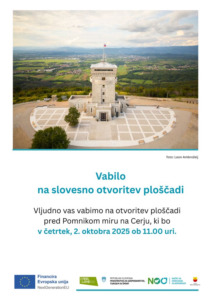 Vabimo vas na otvoritev ploščadi pred Pomnikom miru na Cerju, ki bo v četrtek, 2. oktobra 2025 ob 11. uri pred Pomnikom miru na Cerju (Lokvica 35, 5291 Miren).