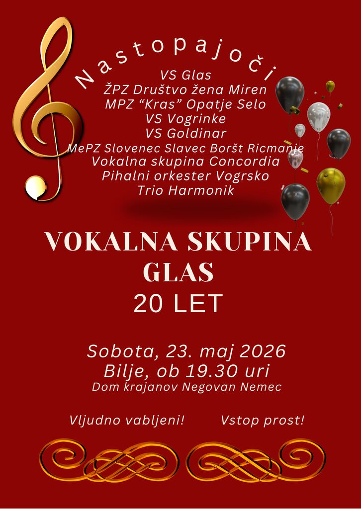 Vabljeni na prireditev v počastitev 20 let delovanja Vokalne skupine Glas v soboto, 23. maja 2026 ob 19.30 uri.