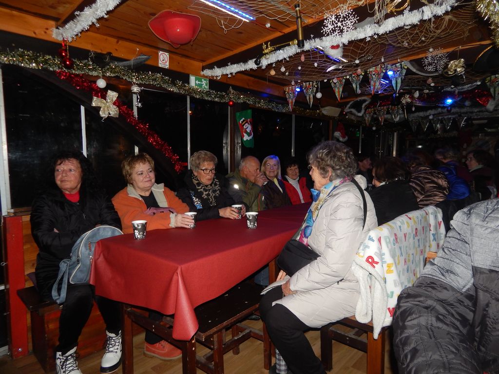 Vesela druščina se nas je odpravila na popoldansko večerni izlet v torek, 12. decembra. Ob planirani uri smo prispeli v Arboretum, ki je v teh dneh lepo praznično okrašen. Za ogled okrašenega parka smo si vzeli kar nekaj časa. Izvirna je bila postavitev lesenih jaslic ob slapu v parku. Po ogledu parka smo se ob našem avtobusu okrepčali in se odpravili proti Ljubljani oz. do pristanišča ob Ljubljanici, kjer nas je pričakal sam ladijski "prvi oficir krova".
