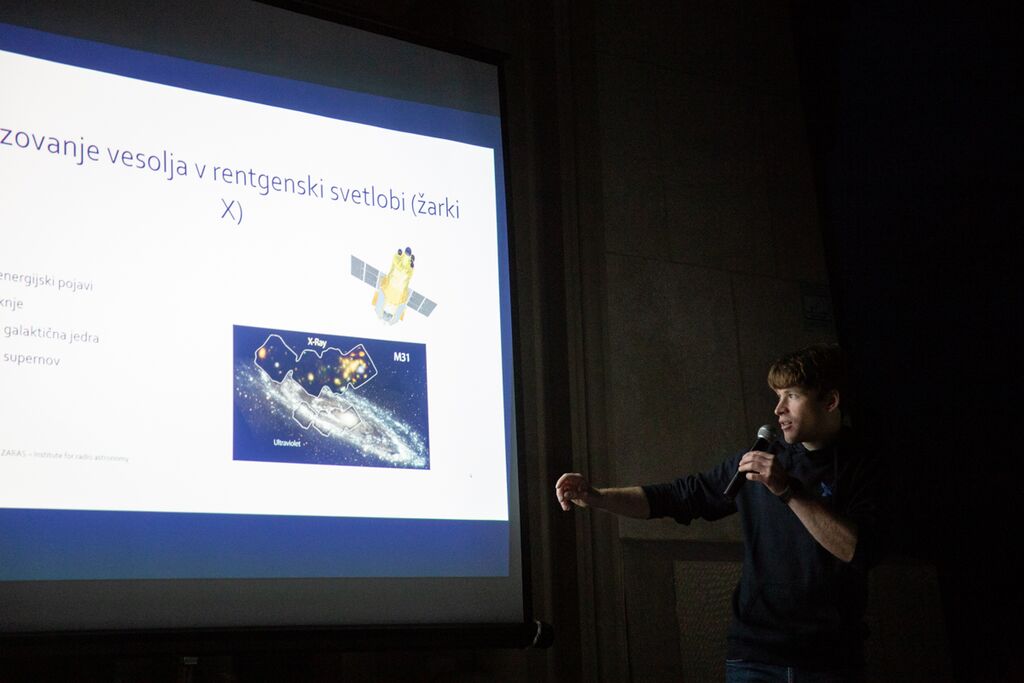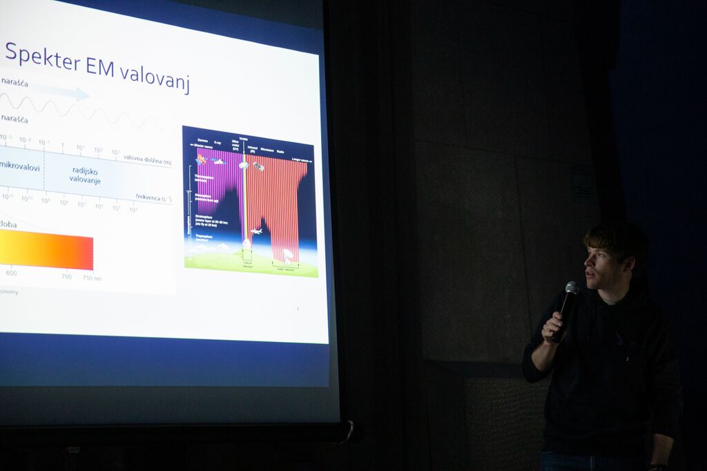 Na kratko je predstavil tudi tematiko lastne magistrske naloge, ki zajema razvoj zaščite sprejemnika mikrovalov pred motnjami. Ti zaščitni elementi bodo uporabljeni na vesoljskem teleskopu za opazovanje mikrovalovnega sevanja ozadja, ki predstavlja ostanek svetlobe izsevane ob velikem poku. Za zaključek je predstavil še opazovanje kozmičnih delcev. To so protoni, elektroni in drugi delci z veliko energijo, ki priletijo iz vesolja v Zemljino atmosfero in povzročijo različne jedrske reakcije. Te opazujemo s pomočjo posebnih detektorjev vkopanih v zemljo ali s posebnim tipom teleskopov za šibke bliske svetlobe, ki so rezultat jedrskih reakcij v atmosferi.