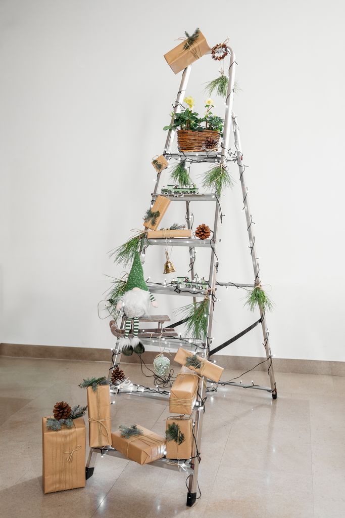 Naj bodo decembrske LESTVE lesene ali kovinske, postavljene pred vhode, na okna, ob drevesa, v notranje prostore, na mize ali police, vedno naj jih krasijo naravni materiali!