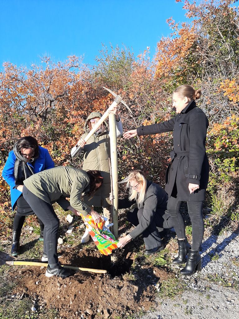 Po zanimivem in poučnem ogledu je razigrano skupino čakala še saditev doniranega drevesa. Ne meneč se za divjanje kraške burje, so se pogumno opremile s pripomočki, zavihale rokave in na izbrani lokaciji poprijele za kramp.