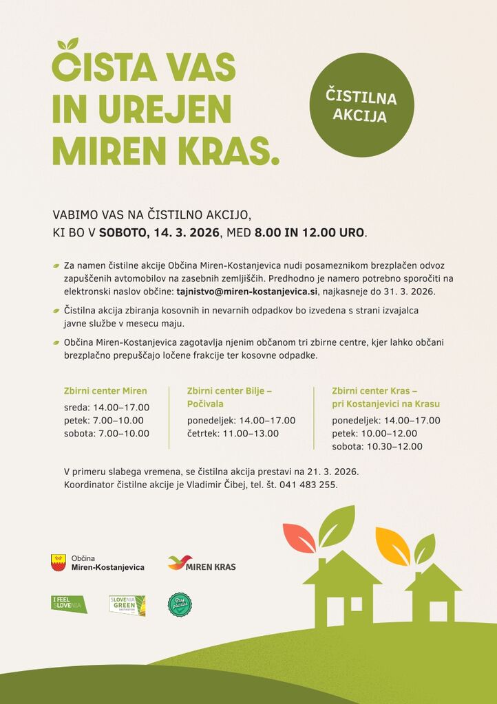 V soboto, 14. marca 2026, bo od 8.00 do 12.00, v Občini Miren-Kostanjevica potekala čistilna akcija »Čista vas in urejen Miren Kras«. Skupaj bomo poskrbeli, da bo naše okolje še lepše in prijetnejše za življenje.
