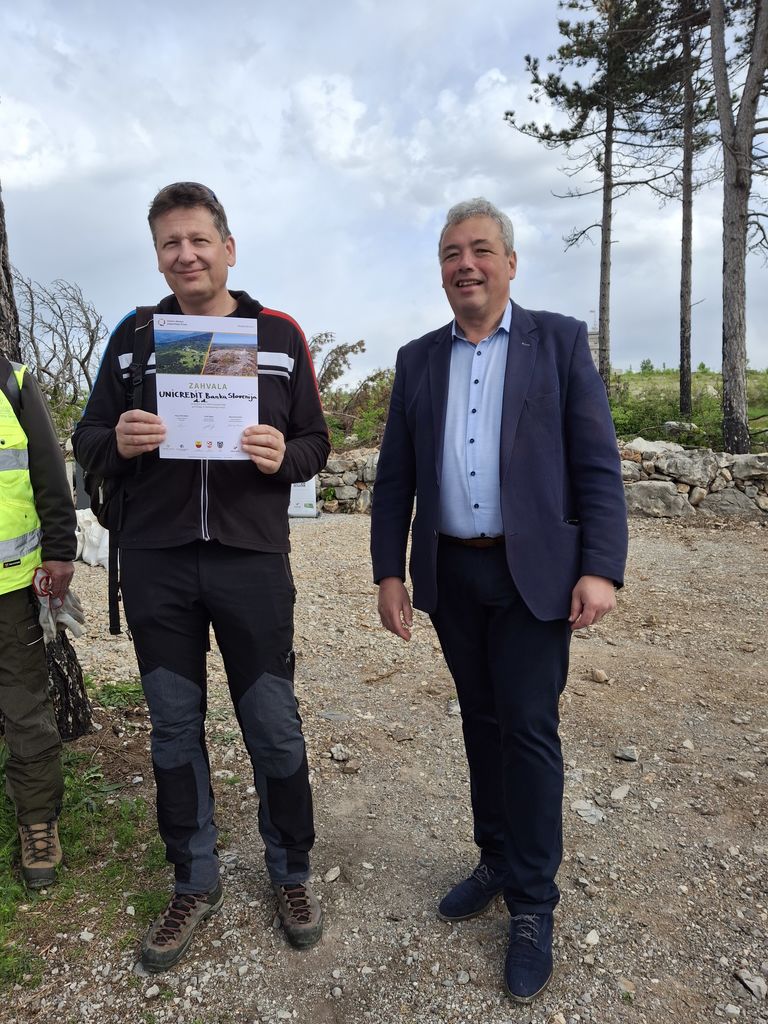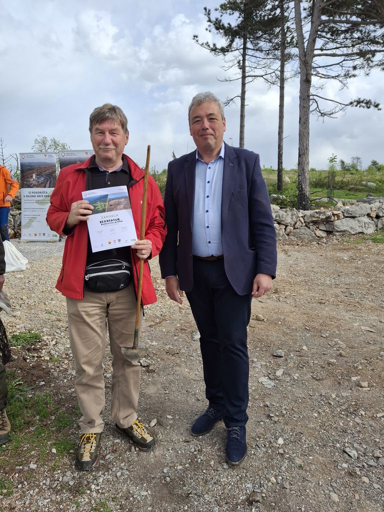 Zbrane je nagovoril tudi župan občine Miren-Kostanjevica, g. Mavricij Humar, ki se je zahvalil za pripravljenost pomagati pri obnovi gozdov na Krasu in za sodelovanje na dogodkih sajenja, ki ne samo obnavljajo pokrajino, temveč tudi povezujejo in združujejo ljudi in naravo. Predstavnikom vseh treh skupin udeležencev današnje sadnje je podelil priznanja za udeležbo.