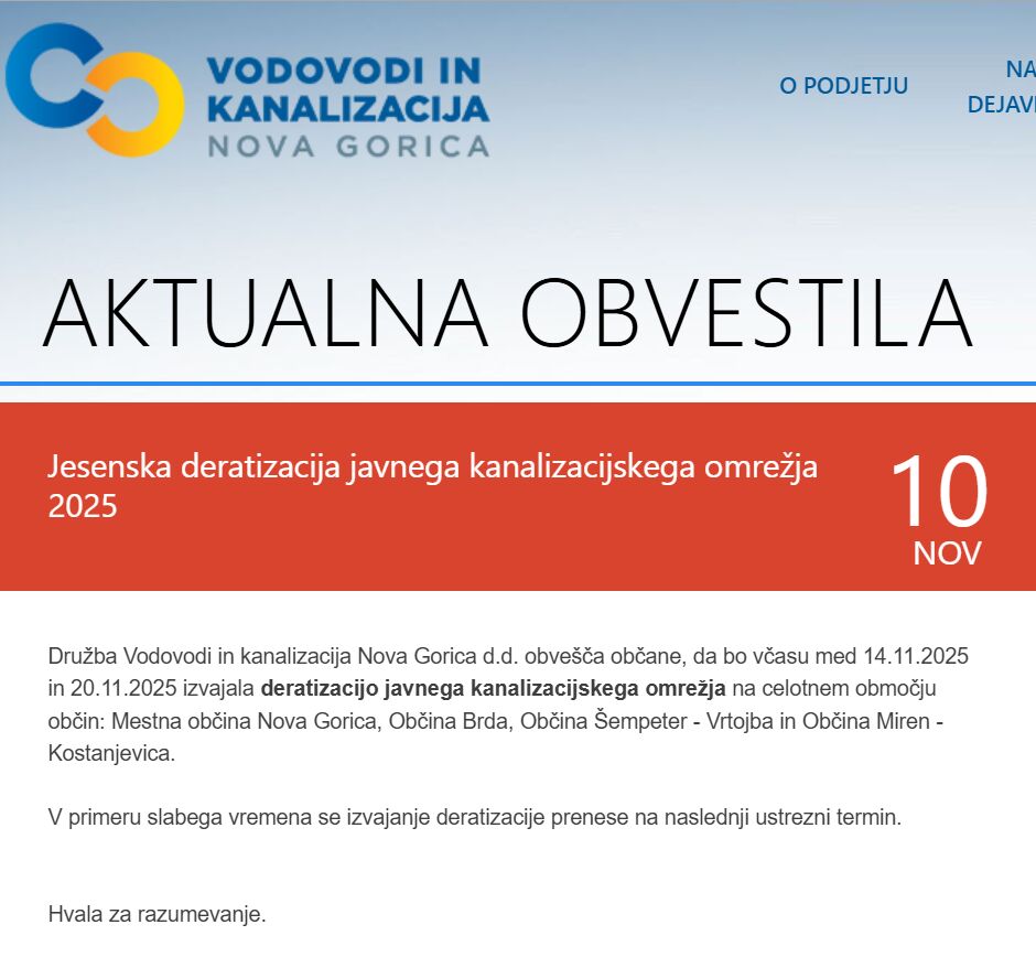Družba Vodovodi in kanalizacija Nova Gorica d.d. obvešča občane, da bo včasu med 14.11.2025 in 20.11.2025 izvajala deratizacijo javnega kanalizacijskega omrežja na celotnem območju občin: Mestna občina Nova Gorica, Občina Brda, Občina Šempeter - Vrtojba in Občina Miren - Kostanjevica.