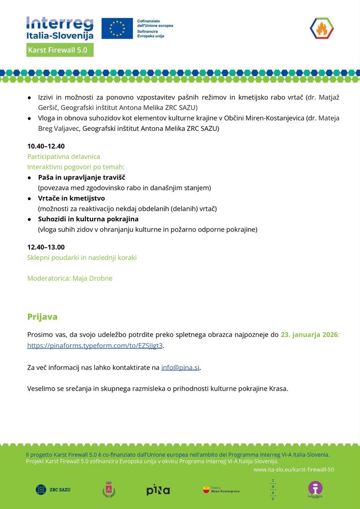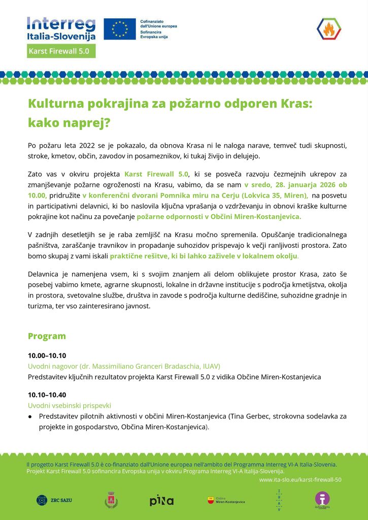Zato vas v okviru projekta Karst Firewall 5.0, ki se posveča razvoju čezmejnih ukrepov za zmanjševanje požarne ogroženosti na Krasu, vabimo, da se nam v sredo, 28. januarja 2026 ob 10.00, pridružite v konferenčni dvorani Pomnika miru na Cerju (Lokvica 35, Miren), na posvetu in participativni delavnici, ki bo naslovila ključna vprašanja o vzdrževanju in obnovi kraške kulturne pokrajine kot načinu za povečanje požarne odpornosti v Občini Miren-Kostanjevica.