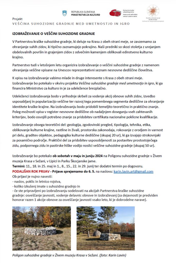 K vpisu na izobraževanje vabijo mlade in druge interesente s Krasa z obeh strani meje. Izobraževanje bo potekalo v okviru projekta Veščina suhozidne gradnje med umetnostjo in igro, ki ga financira Ministrstvo za kulturo in je za udeležence brezplačno. Udeleženci izobraževanja bodo v prihodnje skrbeli za vodenje akcij obnove suhih zidov, izvedbo usposabljanj in popularizacijo veščine ter razvoj tega pomembnega segmenta dediščine za ohranjanje identitete kraške krajine. Na izobraževanju bodo pridobili temeljito teoretično in praktično znanje. Poleg možnosti vpisa v register nesnovne dediščine ob nadaljnjem doseganju vseh zahtevanih kriterijev, bodo osvojili potrebno znanje za pridobitev certifikata nacionalne poklicne kvalifikacije.