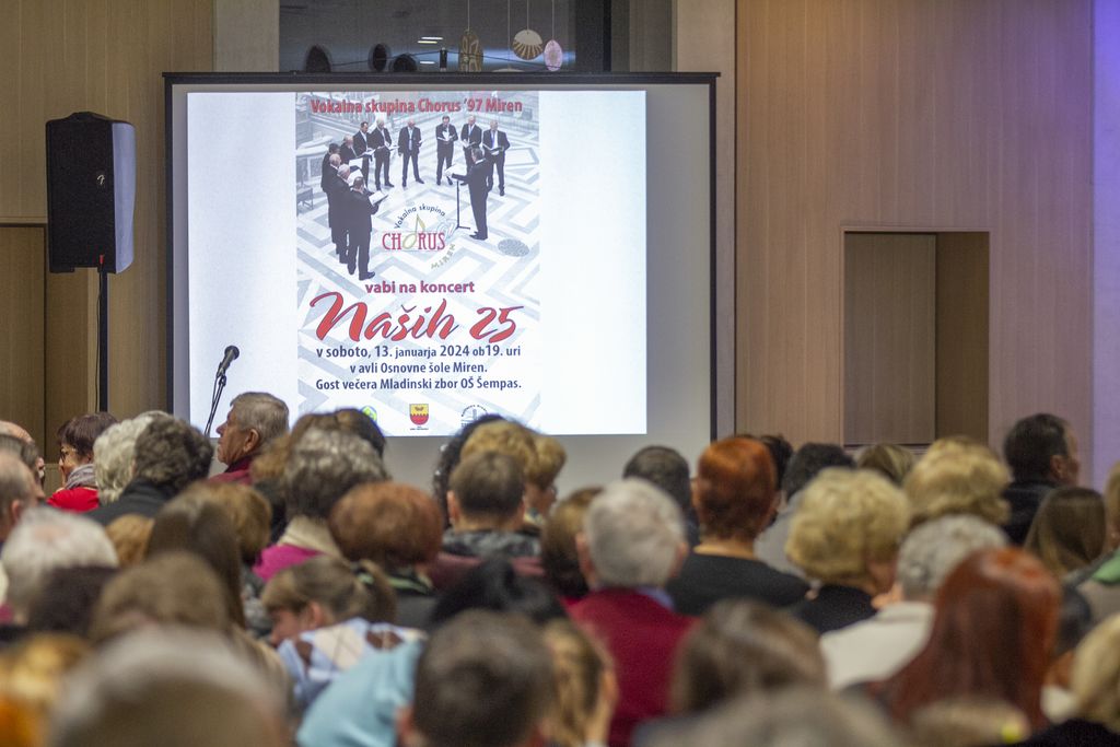 Vokalna skupina Chorus ’97 je v soboto, 13. januarja 2024 s koncertom proslavila svojih 25 let delovanja. V avli Osnovne šole Miren se je zbralo lepo število ljubiteljev petja, ki so prisluhnili jubilantom in njihovim gostom, Mladinskemu zboru Osnovne šole Šempas in sopranistki Ivani Jug.