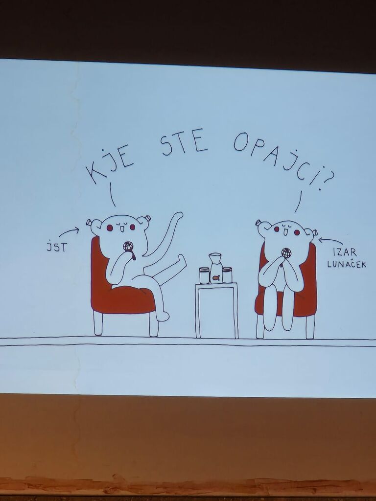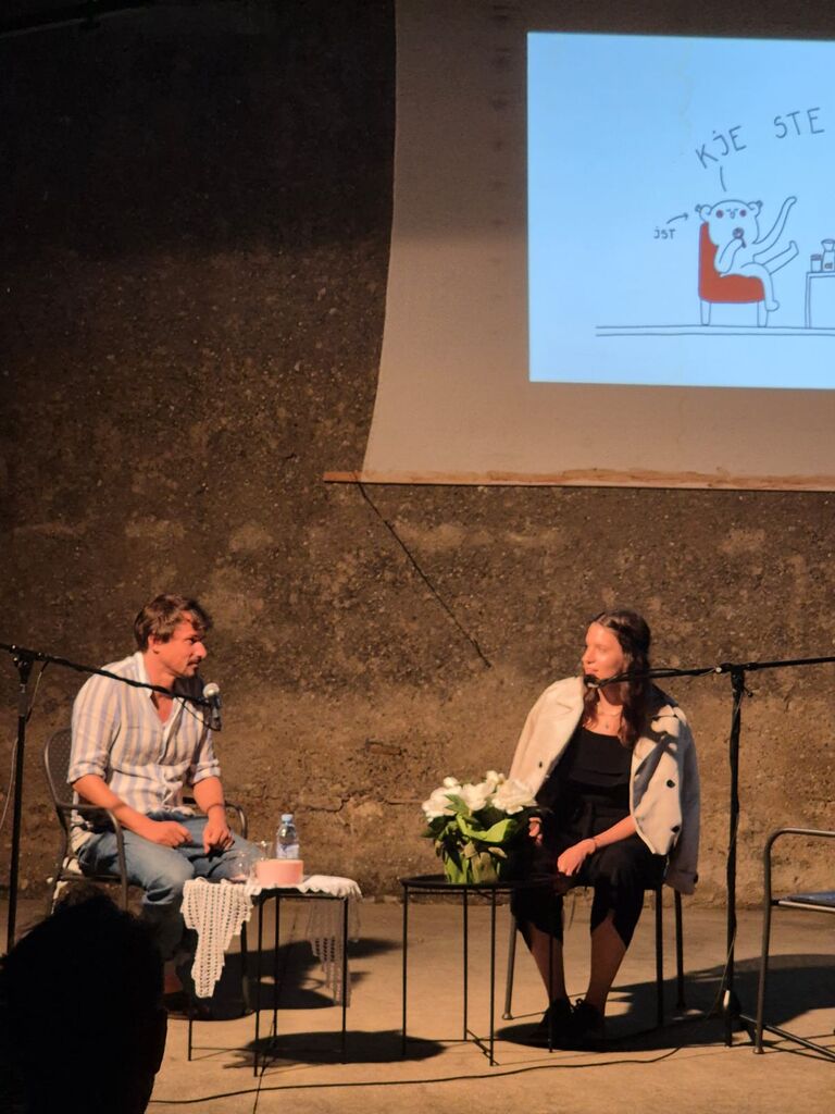 Po ogledu razstave se je večer nadaljeval v duhu besede in humorja, saj sta sledila literarni večer in pogovor z domačo striparko, avtorico stripa »Neč nouga«, ki je bil letos nominiran za strip leta za odrasle, ki ustvarja pod imenom #karolinaumetnina - Karolino Marušič ter Izarjem Lunačkom. Avtorja sta z veliko duhovitosti in iskrivosti predstavila svoj pogled na sodobni strip, ustvarjalni proces ter pomen umetnosti v vsakdanjem življenju.